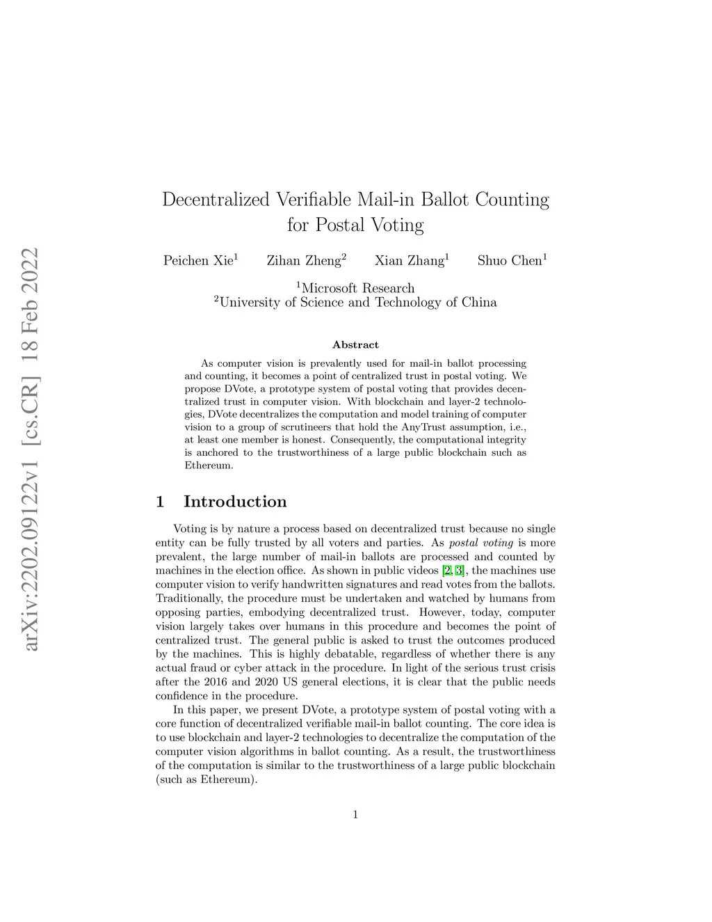 As computer vision is prevalently used for mail-in ballot processing and counting, it becomes a point of centralized trust in postal voting. We propose DVote, a prototype system of postal voting that provides decentralized trust in computer vision. With blockchain and layer-2 technologies, DVote decentralizes the computation and model training of computer vision to a group of scrutineers that hold the AnyTrust assumption, i.e., at least one member is honest. Consequently, the computational integrity is anchored to the trustworthiness of a large public blockchain such as Ethereum.