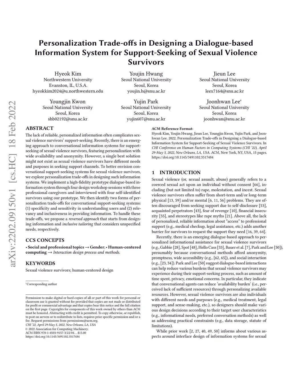 The lack of reliable, personalized information often complicates sexual violence survivors' support-seeking. Recently, there is an emerging approach to conversational information systems for support-seeking of sexual violence survivors, featuring personalization with wide availability and anonymity. However, a single best solution might not exist as sexual violence survivors have different needs and purposes in seeking support channels. To better envision conversational support-seeking systems for sexual violence survivors, we explore personalization trade-offs in designing such information systems. We implement a high-fidelity prototype dialogue-based information system through four design workshop sessions with three professional caregivers and interviewed with four self-identified survivors using our prototype. We then identify two forms of personalization trade-offs for conversational support-seeking systems: (1) specificity and sensitivity in understanding users and (2) relevancy and inclusiveness in providing information. To handle these trade-offs, we propose a reversed approach that starts from designing information and inclusive tailoring that considers unspecified needs, respectively.