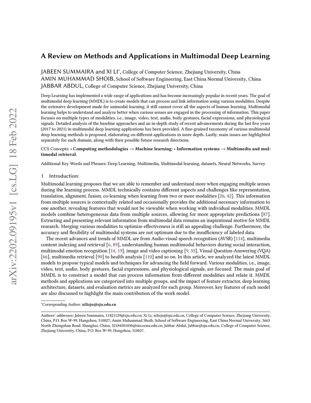 Deep Learning has implemented a wide range of applications and has become increasingly popular in recent years. The goal of multimodal deep learning (MMDL) is to create models that can process and link information using various modalities. Despite the extensive development made for unimodal learning, it still cannot cover all the aspects of human learning. Multimodal learning helps to understand and analyze better when various senses are engaged in the processing of information. This paper focuses on multiple types of modalities, i.e., image, video, text, audio, body gestures, facial expressions, and physiological signals. Detailed analysis of the baseline approaches and an in-depth study of recent advancements during the last five years (2017 to 2021) in multimodal deep learning applications has been provided. A fine-grained taxonomy of various multimodal deep learning methods is proposed, elaborating on different applications in more depth. Lastly, main issues are highlighted separately for each domain, along with their possible future research directions.