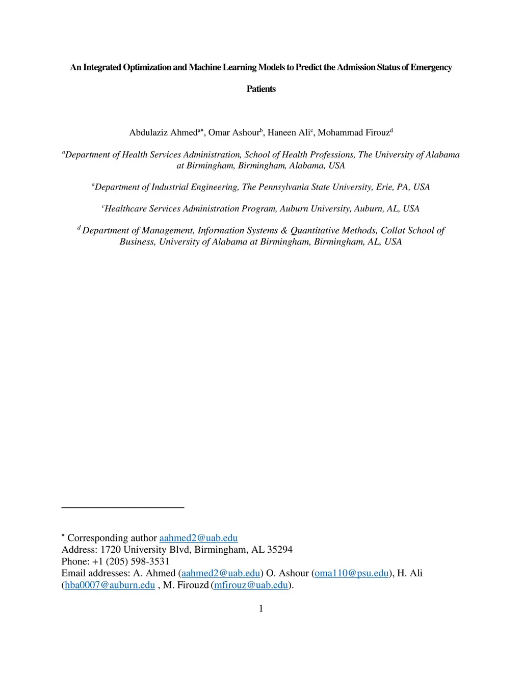 This work proposes a framework for optimizing machine learning algorithms. The practicality of the framework is illustrated using an important case study from the healthcare domain, which is predicting the admission status of emergency department (ED) patients (e.g., admitted vs. discharged) using patient data at the time of triage. The proposed framework can mitigate the crowding problem by proactively planning the patient boarding process. A large retrospective dataset of patient records is obtained from the electronic health record database of all ED visits over three years from three major locations of a healthcare provider in the Midwest of the US. Three machine learning algorithms are proposed: T-XGB, T-ADAB, and T-MLP. T-XGB integrates extreme gradient boosting (XGB) and Tabu Search (TS), T-ADAB integrates Adaboost and TS, and T-MLP integrates multi-layer perceptron (MLP) and TS. The proposed algorithms are compared with the traditional algorithms: XGB, ADAB, and MLP, in which their parameters are tunned using grid search. The three proposed algorithms and the original ones are trained and tested using nine data groups that are obtained from different feature selection methods. In other words, 54 models are developed. Performance was evaluated using five measures: Area under the curve (AUC), sensitivity, specificity, F1, and accuracy. The results show that the newly proposed algorithms resulted in high AUC and outperformed the traditional algorithms. The T-ADAB performs the best among the newly developed algorithms. The AUC, sensitivity, specificity, F1, and accuracy of the best model are 95.4%, 99.3%, 91.4%, 95.2%, 97.2%, respectively.