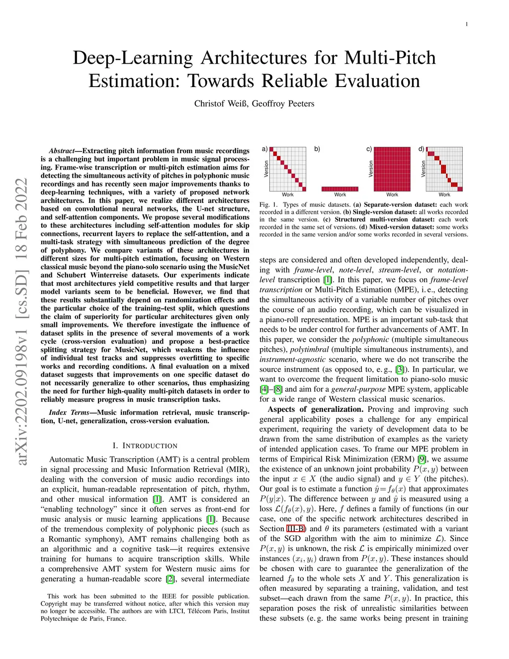 Extracting pitch information from music recordings is a challenging but important problem in music signal processing. Frame-wise transcription or multi-pitch estimation aims for detecting the simultaneous activity of pitches in polyphonic music recordings and has recently seen major improvements thanks to deep-learning techniques, with a variety of proposed network architectures. In this paper, we realize different architectures based on CNNs, the U-net structure, and self-attention components. We propose several modifications to these architectures including self-attention modules for skip connections, recurrent layers to replace the self-attention, and a multi-task strategy with simultaneous prediction of the degree of polyphony. We compare variants of these architectures in different sizes for multi-pitch estimation, focusing on Western classical music beyond the piano-solo scenario using the MusicNet and Schubert Winterreise datasets. Our experiments indicate that most architectures yield competitive results and that larger model variants seem to be beneficial. However, we find that these results substantially depend on randomization effects and the particular choice of the training-test split, which questions the claim of superiority for particular architectures given only small improvements. We therefore investigate the influence of dataset splits in the presence of several movements of a work cycle (cross-version evaluation) and propose a best-practice splitting strategy for MusicNet, which weakens the influence of individual test tracks and suppresses overfitting to specific works and recording conditions. A final evaluation on a mixed dataset suggests that improvements on one specific dataset do not necessarily generalize to other scenarios, thus emphasizing the need for further high-quality multi-pitch datasets in order to reliably measure progress in music transcription tasks.