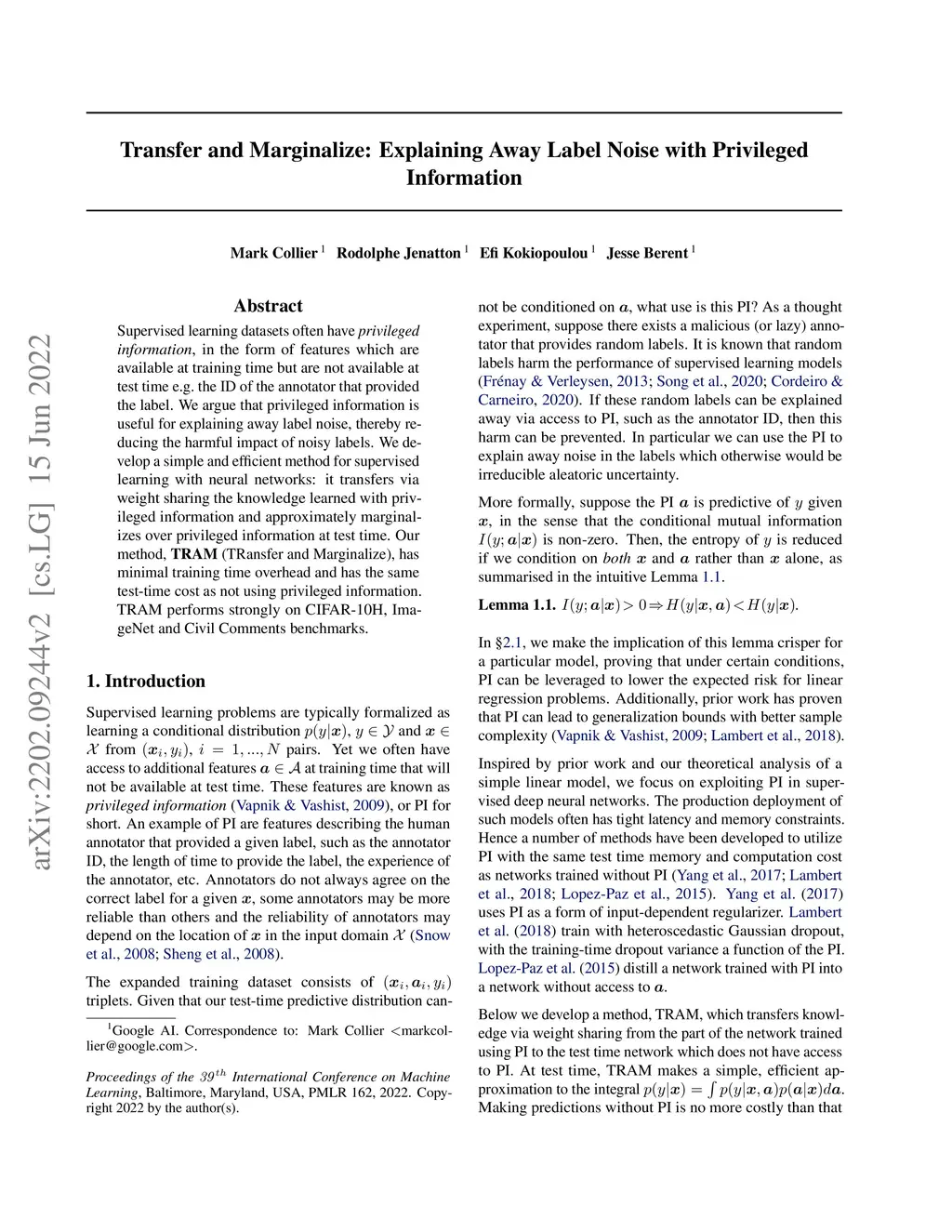 Supervised learning datasets often have privileged information, in the form of features which are available at training time but are not available at test time e.g. the ID of the annotator that provided the label. We argue that privileged information is useful for explaining away label noise, thereby reducing the harmful impact of noisy labels. We develop a simple and efficient method for supervised learning with neural networks: it transfers via weight sharing the knowledge learned with privileged information and approximately marginalizes over privileged information at test time. Our method, TRAM (TRansfer and Marginalize), has minimal training time overhead and has the same test-time cost as not using privileged information. TRAM performs strongly on CIFAR-10H, ImageNet and Civil Comments benchmarks.