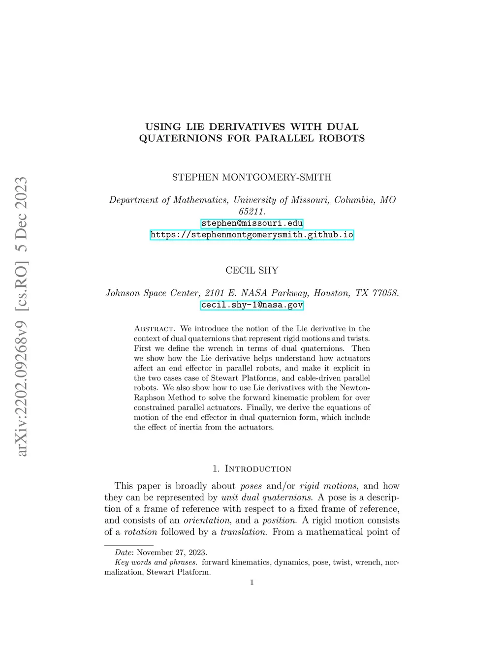 We introduce the notion of the Lie derivative in the context of dual quaternions that represent rigid motions and twists. First we define the wrench in terms of dual quaternions. Then we show how the Lie derivative helps understand how actuators affect an end effector in parallel robots, and make it explicit in the two cases case of Stewart Platforms, and cable-driven parallel robots. We also show how to use Lie derivatives with the Newton-Raphson Method to solve the forward kinematic problem for over constrained parallel actuators. Finally, we derive the equations of motion of the end effector in dual quaternion form, which include the effect of inertia from the actuators.