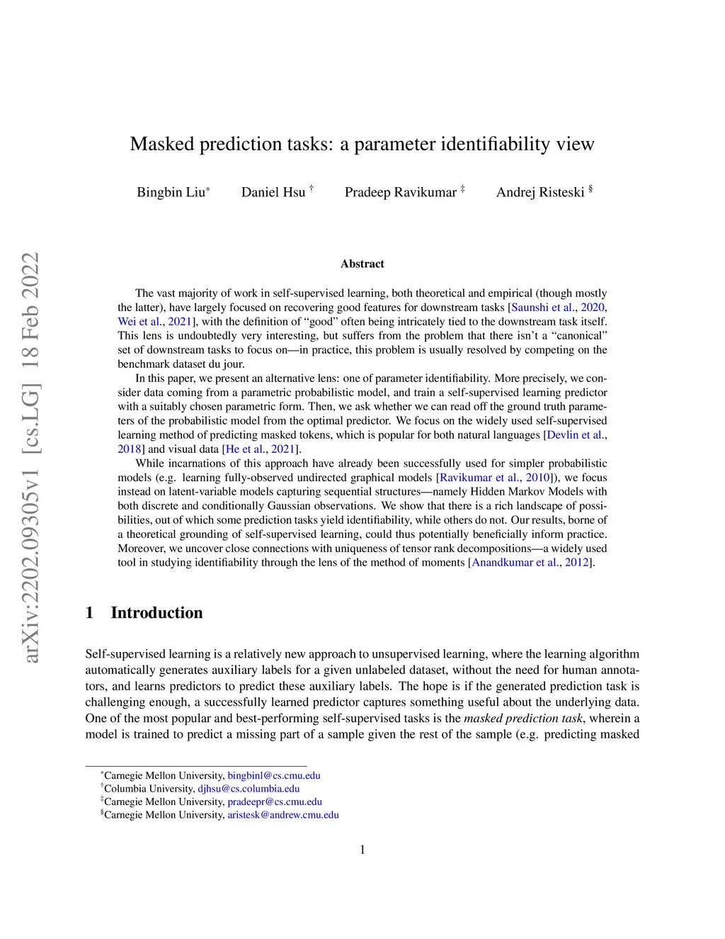 Masked prediction tasks: a parameter identifiability view