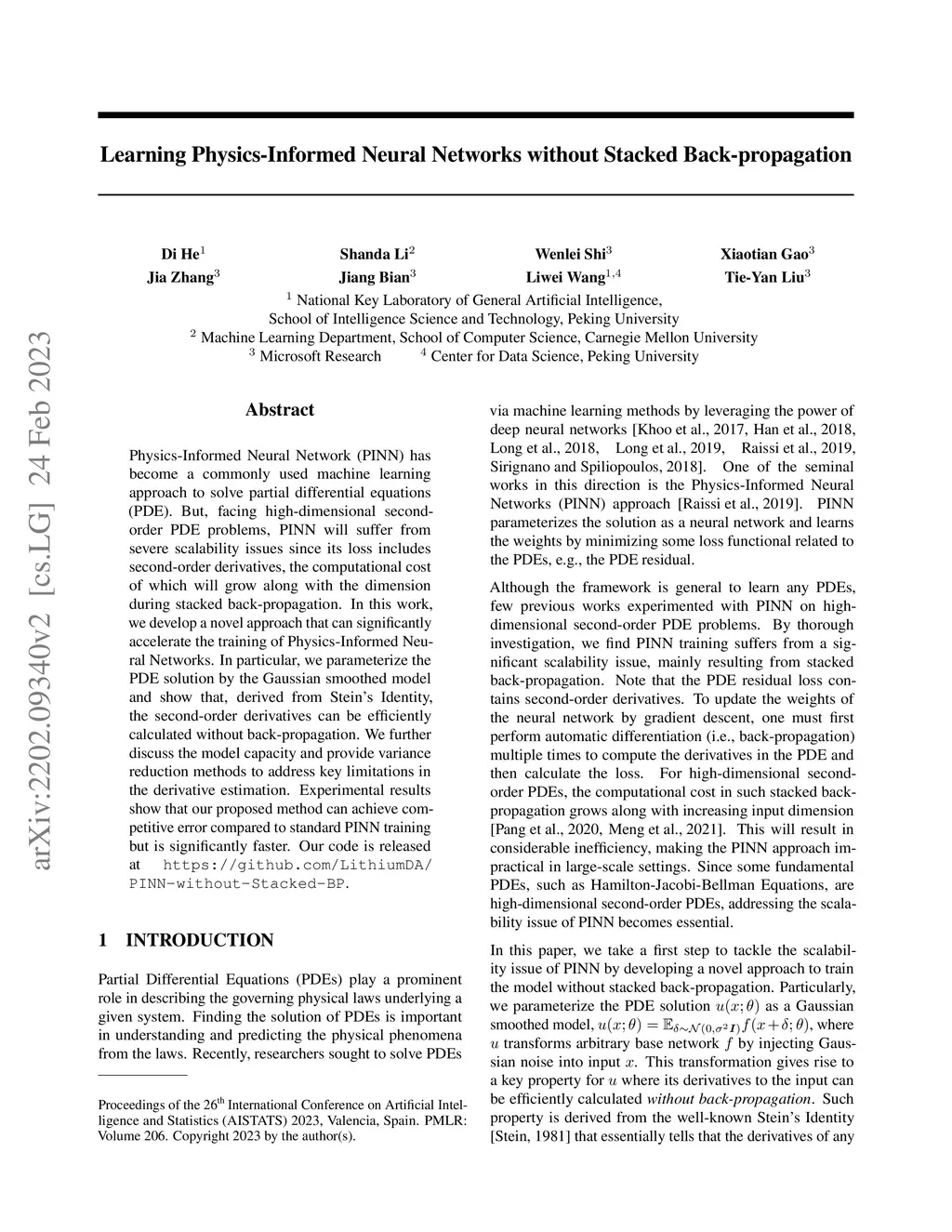 Physics-Informed Neural Network (PINN) has become a commonly used machine learning approach to solve partial differential equations (PDE). But, facing high-dimensional secondorder PDE problems, PINN will suffer from severe scalability issues since its loss includes second-order derivatives, the computational cost of which will grow along with the dimension during stacked back-propagation. In this work, we develop a novel approach that can significantly accelerate the training of Physics-Informed Neural Networks. In particular, we parameterize the PDE solution by the Gaussian smoothed model and show that, derived from Stein's Identity, the second-order derivatives can be efficiently calculated without back-propagation. We further discuss the model capacity and provide variance reduction methods to address key limitations in the derivative estimation. Experimental results show that our proposed method can achieve competitive error compared to standard PINN training but is significantly faster. Our code is released at https://github.com/LithiumDA/PINN-without-Stacked-BP.