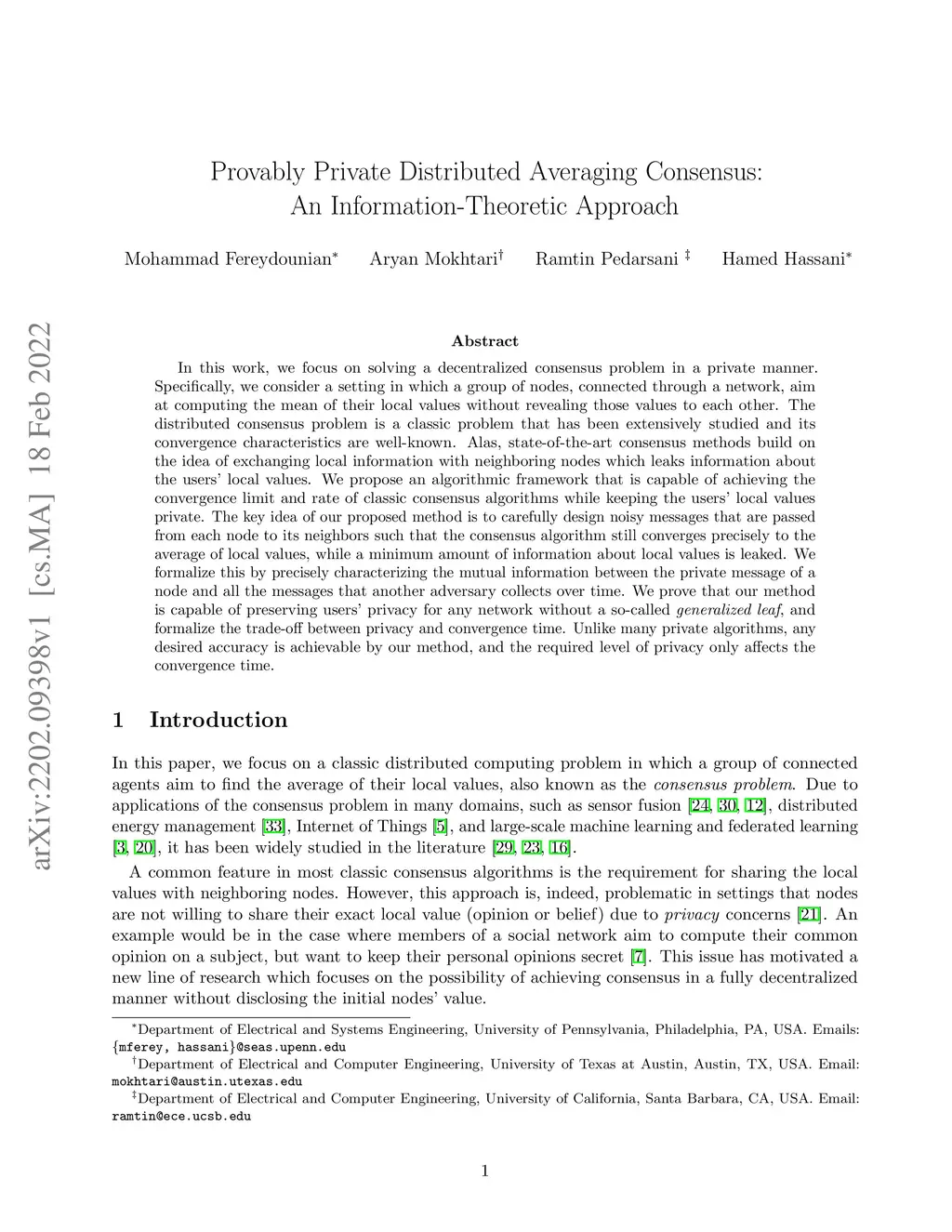 In this work, we focus on solving a decentralized consensus problem in a private manner. Specifically, we consider a setting in which a group of nodes, connected through a network, aim at computing the mean of their local values without revealing those values to each other. The distributed consensus problem is a classic problem that has been extensively studied and its convergence characteristics are well-known. Alas, state-of-the-art consensus methods build on the idea of exchanging local information with neighboring nodes which leaks information about the users' local values. We propose an algorithmic framework that is capable of achieving the convergence limit and rate of classic consensus algorithms while keeping the users' local values private. The key idea of our proposed method is to carefully design noisy messages that are passed from each node to its neighbors such that the consensus algorithm still converges precisely to the average of local values, while a minimum amount of information about local values is leaked. We formalize this by precisely characterizing the mutual information between the private message of a node and all the messages that another adversary collects over time. We prove that our method is capable of preserving users' privacy for any network without a so-called "generalized leaf", and formalize the trade-off between privacy and convergence time. Unlike many private algorithms, any desired accuracy is achievable by our method, and the required level of privacy only affects the convergence time.