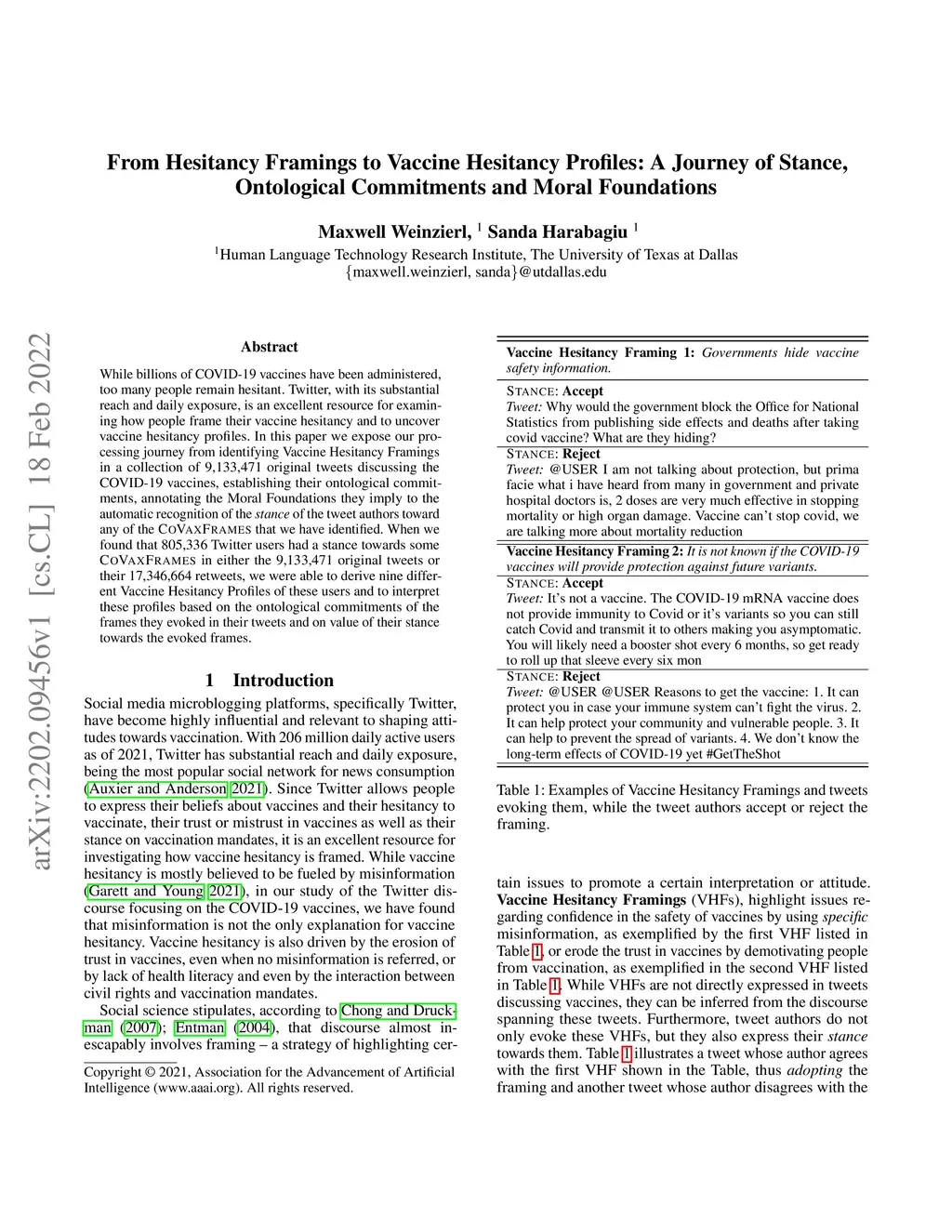 While billions of COVID-19 vaccines have been administered, too many people remain hesitant. Twitter, with its substantial reach and daily exposure, is an excellent resource for examining how people frame their vaccine hesitancy and to uncover vaccine hesitancy profiles. In this paper we expose our processing journey from identifying Vaccine Hesitancy Framings in a collection of 9,133,471 original tweets discussing the COVID-19 vaccines, establishing their ontological commitments, annotating the Moral Foundations they imply to the automatic recognition of the stance of the tweet authors toward any of the CoVaxFrames that we have identified. When we found that 805,336 Twitter users had a stance towards some CoVaxFrames in either the 9,133,471 original tweets or their 17,346,664 retweets, we were able to derive nine different Vaccine Hesitancy Profiles of these users and to interpret these profiles based on the ontological commitments of the frames they evoked in their tweets and on value of their stance towards the evoked frames.
