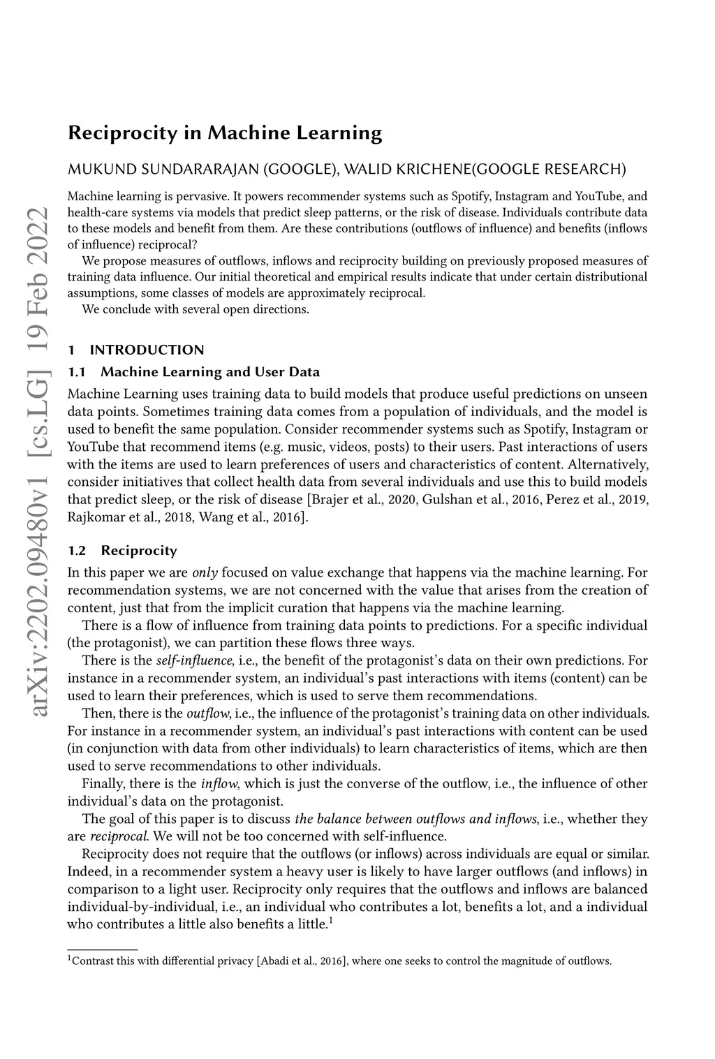 Machine learning is pervasive. It powers recommender systems such as Spotify, Instagram and YouTube, and health-care systems via models that predict sleep patterns, or the risk of disease. Individuals contribute data to these models and benefit from them. Are these contributions (outflows of influence) and benefits (inflows of influence) reciprocal? We propose measures of outflows, inflows and reciprocity building on previously proposed measures of training data influence. Our initial theoretical and empirical results indicate that under certain distributional assumptions, some classes of models are approximately reciprocal. We conclude with several open directions.