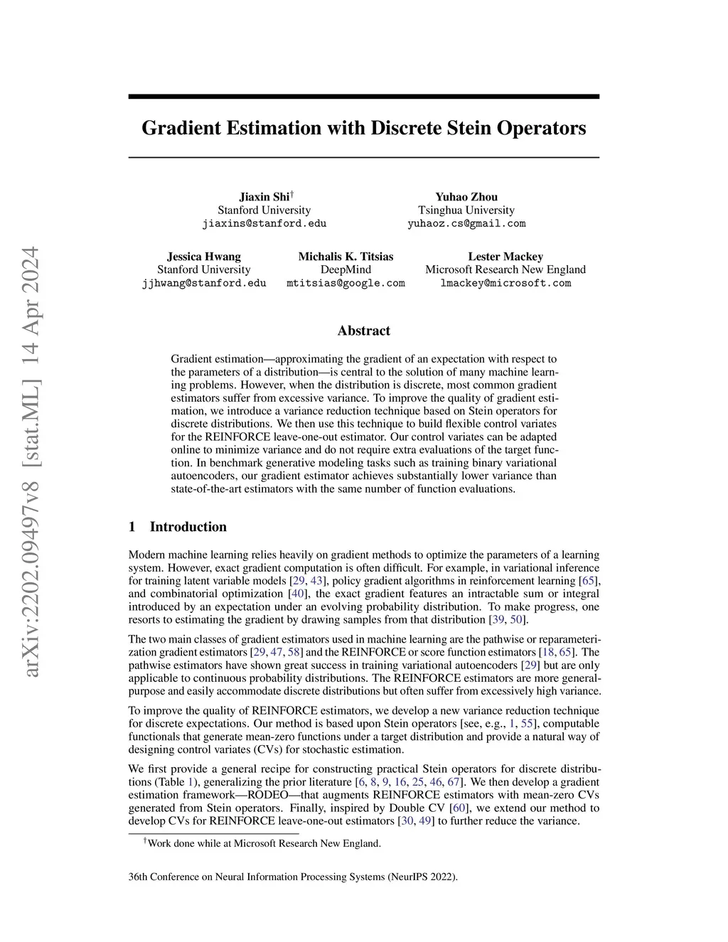 Gradient estimation -- approximating the gradient of an expectation with respect to the parameters of a distribution -- is central to the solution of many machine learning problems. However, when the distribution is discrete, most common gradient estimators suffer from excessive variance. To improve the quality of gradient estimation, we introduce a variance reduction technique based on Stein operators for discrete distributions. We then use this technique to build flexible control variates for the REINFORCE leave-one-out estimator. Our control variates can be adapted online to minimize variance and do not require extra evaluations of the target function. In benchmark generative modeling tasks such as training binary variational autoencoders, our gradient estimator achieves substantially lower variance than state-of-the-art estimators with the same number of function evaluations.