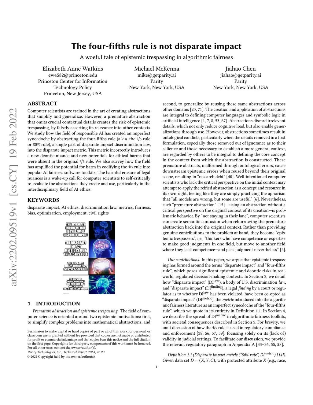 Computer scientists are trained to create abstractions that simplify and generalize. However, a premature abstraction that omits crucial contextual details creates the risk of epistemic trespassing, by falsely asserting its relevance into other contexts. We study how the field of responsible AI has created an imperfect synecdoche by abstracting the four-fifths rule (a.k.a. the 4/5 rule or 80% rule), a single part of disparate impact discrimination law, into the disparate impact metric. This metric incorrectly introduces a new deontic nuance and new potentials for ethical harms that were absent in the original 4/5 rule. We also survey how the field has amplified the potential for harm in codifying the 4/5 rule into popular AI fairness software toolkits. The harmful erasure of legal nuances is a wake-up call for computer scientists to self-critically re-evaluate the abstractions they create and use, particularly in the interdisciplinary field of AI ethics.