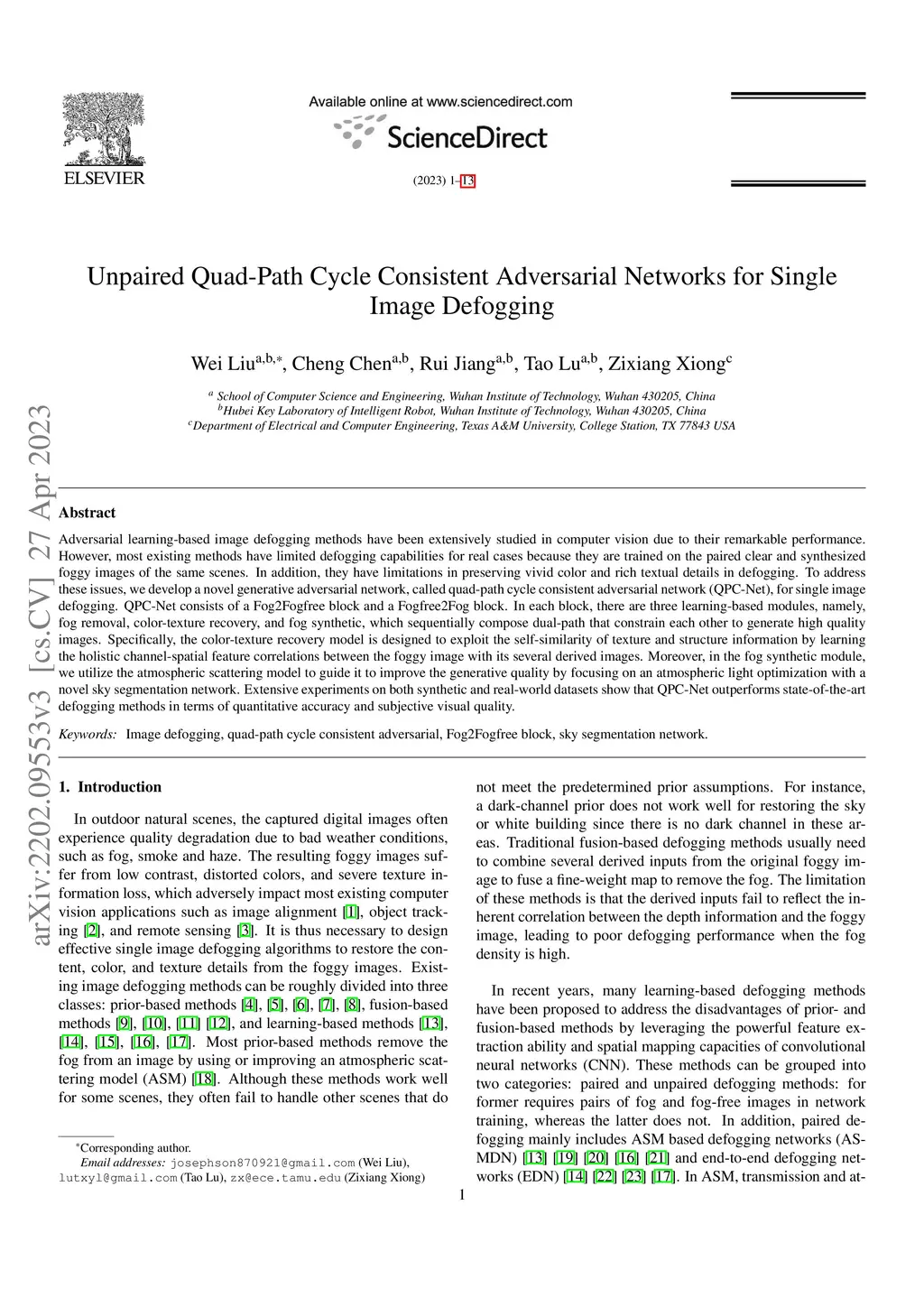 Adversarial learning-based image defogging methods have been extensively studied in computer vision due to their remarkable performance. However, most existing methods have limited defogging capabilities for real cases because they are trained on the paired clear and synthesized foggy images of the same scenes. In addition, they have limitations in preserving vivid color and rich textual details in defogging. To address these issues, we develop a novel generative adversarial network, called quad-path cycle consistent adversarial network (QPC-Net), for single image defogging. QPC-Net consists of a Fog2Fogfree block and a Fogfree2Fog block. In each block, there are three learning-based modules, namely, fog removal, color-texture recovery, and fog synthetic, which sequentially compose dual-path that constrain each other to generate high quality images. Specifically, the color-texture recovery model is designed to exploit the self-similarity of texture and structure information by learning the holistic channel-spatial feature correlations between the foggy image with its several derived images. Moreover, in the fog synthetic module, we utilize the atmospheric scattering model to guide it to improve the generative quality by focusing on an atmospheric light optimization with a novel sky segmentation network. Extensive experiments on both synthetic and real-world datasets show that QPC-Net outperforms state-of-the-art defogging methods in terms of quantitative accuracy and subjective visual quality.