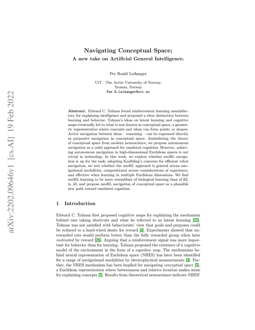 Edward C. Tolman found reinforcement learning unsatisfactory for explaining intelligence and proposed a clear distinction between learning and behavior. Tolman's ideas on latent learning and cognitive maps eventually led to what is now known as conceptual space, a geometric representation where concepts and ideas can form points or shapes.Active navigation between ideas - reasoning - can be expressed directly as purposive navigation in conceptual space. Assimilating the theory of conceptual space from modern neuroscience, we propose autonomous navigation as a valid approach for emulated cognition. However, achieving autonomous navigation in high-dimensional Euclidean spaces is not trivial in technology. In this work, we explore whether neoRL navigation is up for the task; adopting Kaelbling's concerns for efficient robot navigation, we test whether the neoRL approach is general across navigational modalities, compositional across considerations of experience, and effective when learning in multiple Euclidean dimensions. We find neoRL learning to be more resemblant of biological learning than of RL in AI, and propose neoRL navigation of conceptual space as a plausible new path toward emulated cognition.