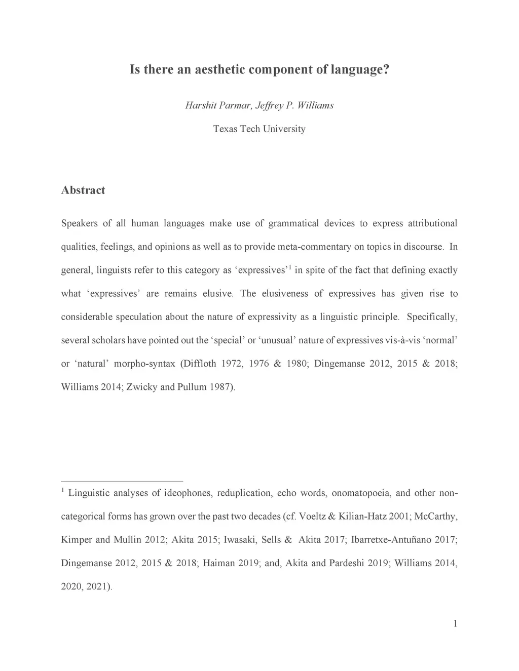 Speakers of all human languages make use of grammatical devices to express attributional qualities, feelings, and opinions as well as to provide meta-commentary on topics in discourse. In general, linguists refer to this category as éxpressivesín spite of the fact that defining exactly what éxpressives' are remains elusive. The elusiveness of expressives has given rise to considerable speculation about the nature of expressivity as a linguistic principle. Specifically, several scholars have pointed out the 'special' or únusual' nature of expressives vis-a-vis ñormal' or ñatural' morpho-syntax.