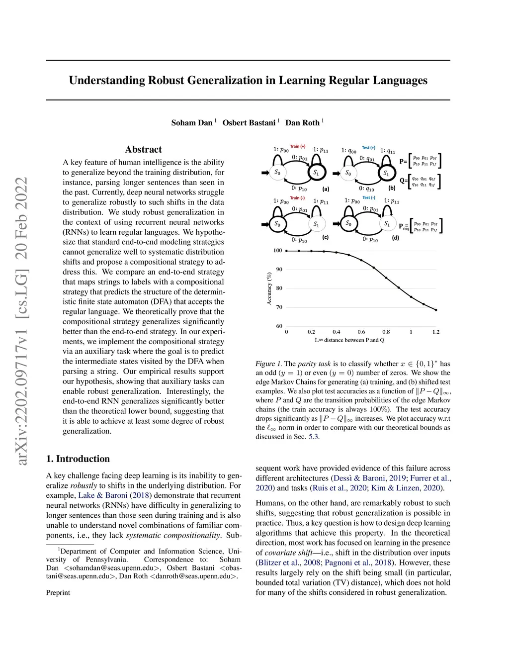 A key feature of human intelligence is the ability to generalize beyond the training distribution, for instance, parsing longer sentences than seen in the past. Currently, deep neural networks struggle to generalize robustly to such shifts in the data distribution. We study robust generalization in the context of using recurrent neural networks (RNNs) to learn regular languages. We hypothesize that standard end-to-end modeling strategies cannot generalize well to systematic distribution shifts and propose a compositional strategy to address this. We compare an end-to-end strategy that maps strings to labels with a compositional strategy that predicts the structure of the deterministic finite-state automaton (DFA) that accepts the regular language. We theoretically prove that the compositional strategy generalizes significantly better than the end-to-end strategy. In our experiments, we implement the compositional strategy via an auxiliary task where the goal is to predict the intermediate states visited by the DFA when parsing a string. Our empirical results support our hypothesis, showing that auxiliary tasks can enable robust generalization. Interestingly, the end-to-end RNN generalizes significantly better than the theoretical lower bound, suggesting that it is able to achieve at least some degree of robust generalization.