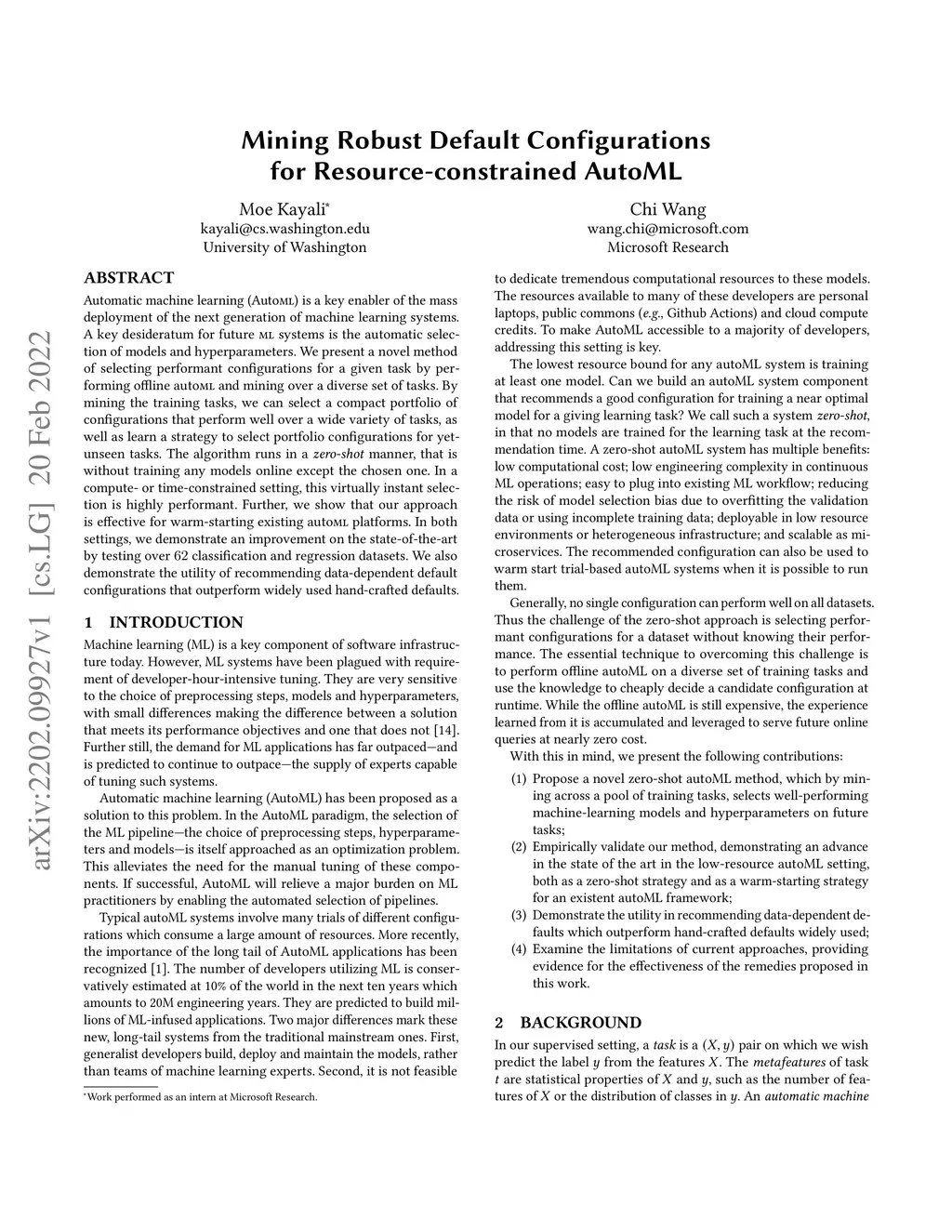 Automatic machine learning (AutoML) is a key enabler of the mass deployment of the next generation of machine learning systems. A key desideratum for future ML systems is the automatic selection of models and hyperparameters. We present a novel method of selecting performant configurations for a given task by performing offline autoML and mining over a diverse set of tasks. By mining the training tasks, we can select a compact portfolio of configurations that perform well over a wide variety of tasks, as well as learn a strategy to select portfolio configurations for yet-unseen tasks. The algorithm runs in a zero-shot manner, that is without training any models online except the chosen one. In a compute- or time-constrained setting, this virtually instant selection is highly performant. Further, we show that our approach is effective for warm-starting existing autoML platforms. In both settings, we demonstrate an improvement on the state-of-the-art by testing over 62 classification and regression datasets. We also demonstrate the utility of recommending data-dependent default configurations that outperform widely used hand-crafted defaults.