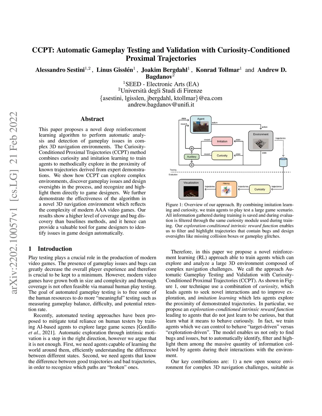This paper proposes a novel deep reinforcement learning algorithm to perform automatic analysis and detection of gameplay issues in complex 3D navigation environments. The Curiosity-Conditioned Proximal Trajectories (CCPT) method combines curiosity and imitation learning to train agents to methodically explore in the proximity of known trajectories derived from expert demonstrations. We show how CCPT can explore complex environments, discover gameplay issues and design oversights in the process, and recognize and highlight them directly to game designers. We further demonstrate the effectiveness of the algorithm in a novel 3D navigation environment which reflects the complexity of modern AAA video games. Our results show a higher level of coverage and bug discovery than baselines methods, and it hence can provide a valuable tool for game designers to identify issues in game design automatically.