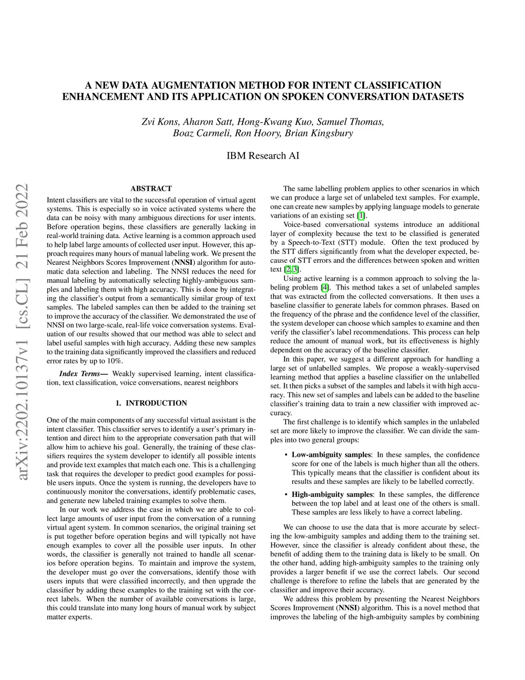 Intent classifiers are vital to the successful operation of virtual agent systems. This is especially so in voice activated systems where the data can be noisy with many ambiguous directions for user intents. Before operation begins, these classifiers are generally lacking in real-world training data. Active learning is a common approach used to help label large amounts of collected user input. However, this approach requires many hours of manual labeling work. We present the Nearest Neighbors Scores Improvement (NNSI) algorithm for automatic data selection and labeling. The NNSI reduces the need for manual labeling by automatically selecting highly-ambiguous samples and labeling them with high accuracy. This is done by integrating the classifier's output from a semantically similar group of text samples. The labeled samples can then be added to the training set to improve the accuracy of the classifier. We demonstrated the use of NNSI on two large-scale, real-life voice conversation systems. Evaluation of our results showed that our method was able to select and label useful samples with high accuracy. Adding these new samples to the training data significantly improved the classifiers and reduced error rates by up to 10%.