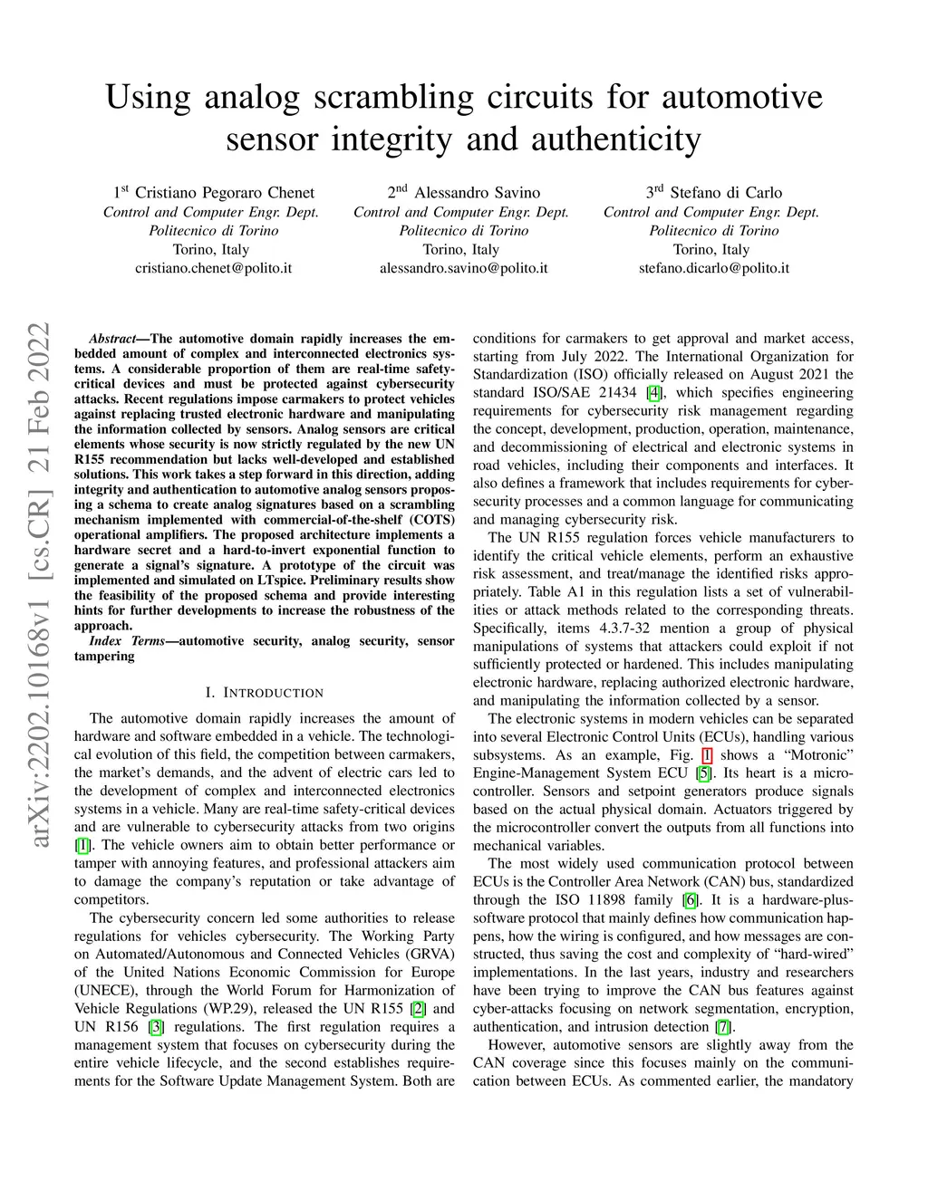 The automotive domain rapidly increases the embedded amount of complex and interconnected electronics systems. A considerable proportion of them are real-time safety-critical devices and must be protected against cybersecurity attacks. Recent regulations impose carmakers to protect vehicles against replacing trusted electronic hardware and manipulating the information collected by sensors. Analog sensors are critical elements whose security is now strictly regulated by the new UN R155 recommendation but lacks well-developed and established solutions. This work takes a step forward in this direction, adding integrity and authentication to automotive analog sensors proposing a schema to create analog signatures based on a scrambling mechanism implemented with commercial-of-the-shelf (COTS) operational amplifiers. The proposed architecture implements a hardware secret and a hard-to-invert exponential function to generate a signal's signature. A prototype of the circuit was implemented and simulated on LTspice. Preliminary results show the feasibility of the proposed schema and provide interesting hints for further developments to increase the robustness of the approach.