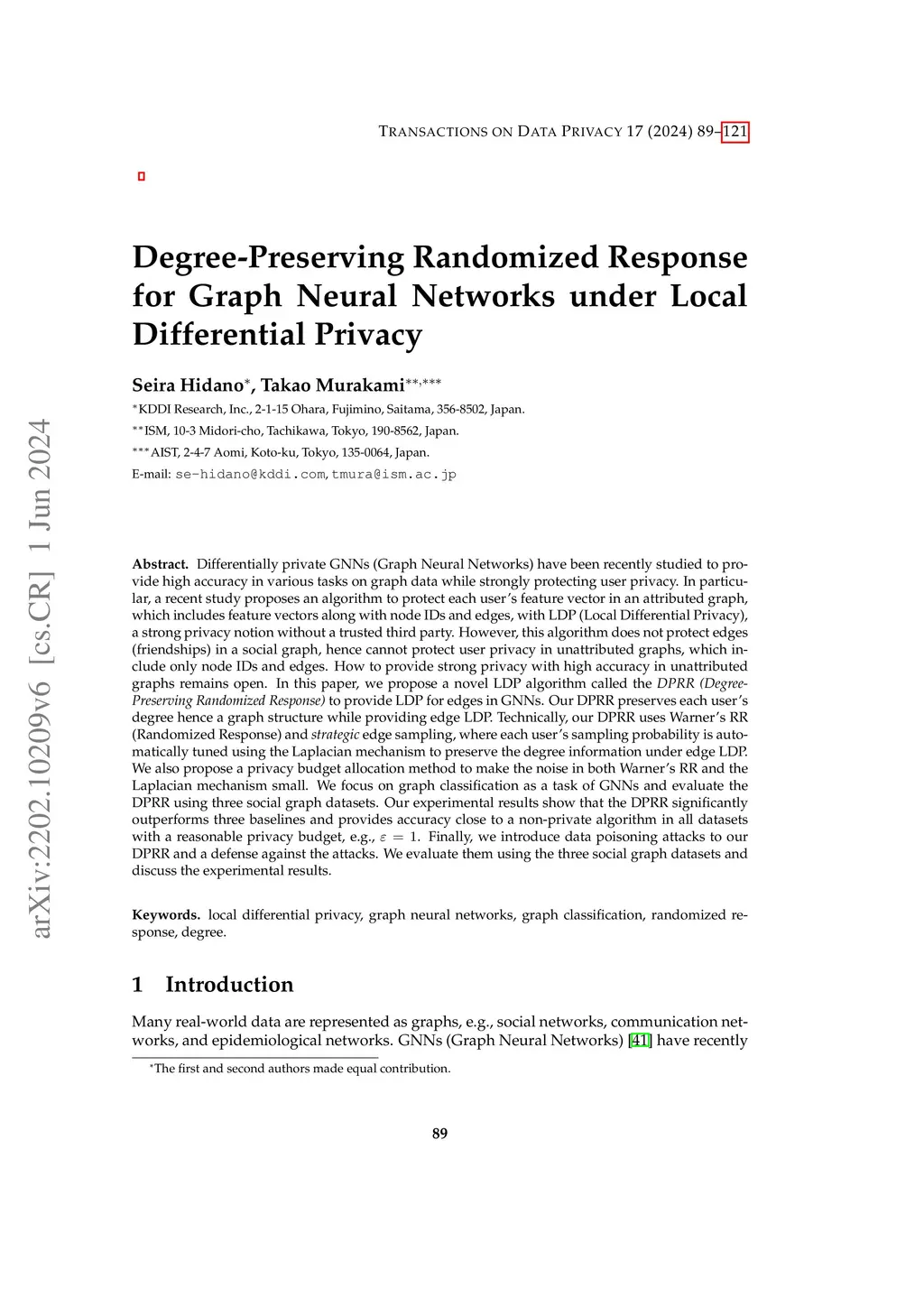 Differentially private GNNs (Graph Neural Networks) have been recently studied to provide high accuracy in various tasks on graph data while strongly protecting user privacy. In particular, a recent study proposes an algorithm to protect each user's feature vector in an attributed graph, which includes feature vectors along with node IDs and edges, with LDP (Local Differential Privacy), a strong privacy notion without a trusted third party. However, this algorithm does not protect edges (friendships) in a social graph, hence cannot protect user privacy in unattributed graphs, which include only node IDs and edges. How to provide strong privacy with high accuracy in unattributed graphs remains open. In this paper, we propose a novel LDP algorithm called the DPRR (Degree-Preserving Randomized Response) to provide LDP for edges in GNNs. Our DPRR preserves each user's degree hence a graph structure while providing edge LDP. Technically, our DPRR uses Warner's RR (Randomized Response) and strategic edge sampling, where each user's sampling probability is automatically tuned using the Laplacian mechanism to preserve the degree information under edge LDP. We also propose a privacy budget allocation method to make the noise in both Warner's RR and the Laplacian mechanism small. We focus on graph classification as a task of GNNs and evaluate the DPRR using three social graph datasets. Our experimental results show that the DPRR significantly outperforms three baselines and provides accuracy close to a non-private algorithm in all datasets with a reasonable privacy budget, e.g., epsilon=1. Finally, we introduce data poisoning attacks to our DPRR and a defense against the attacks. We evaluate them using the three social graph datasets and discuss the experimental results.