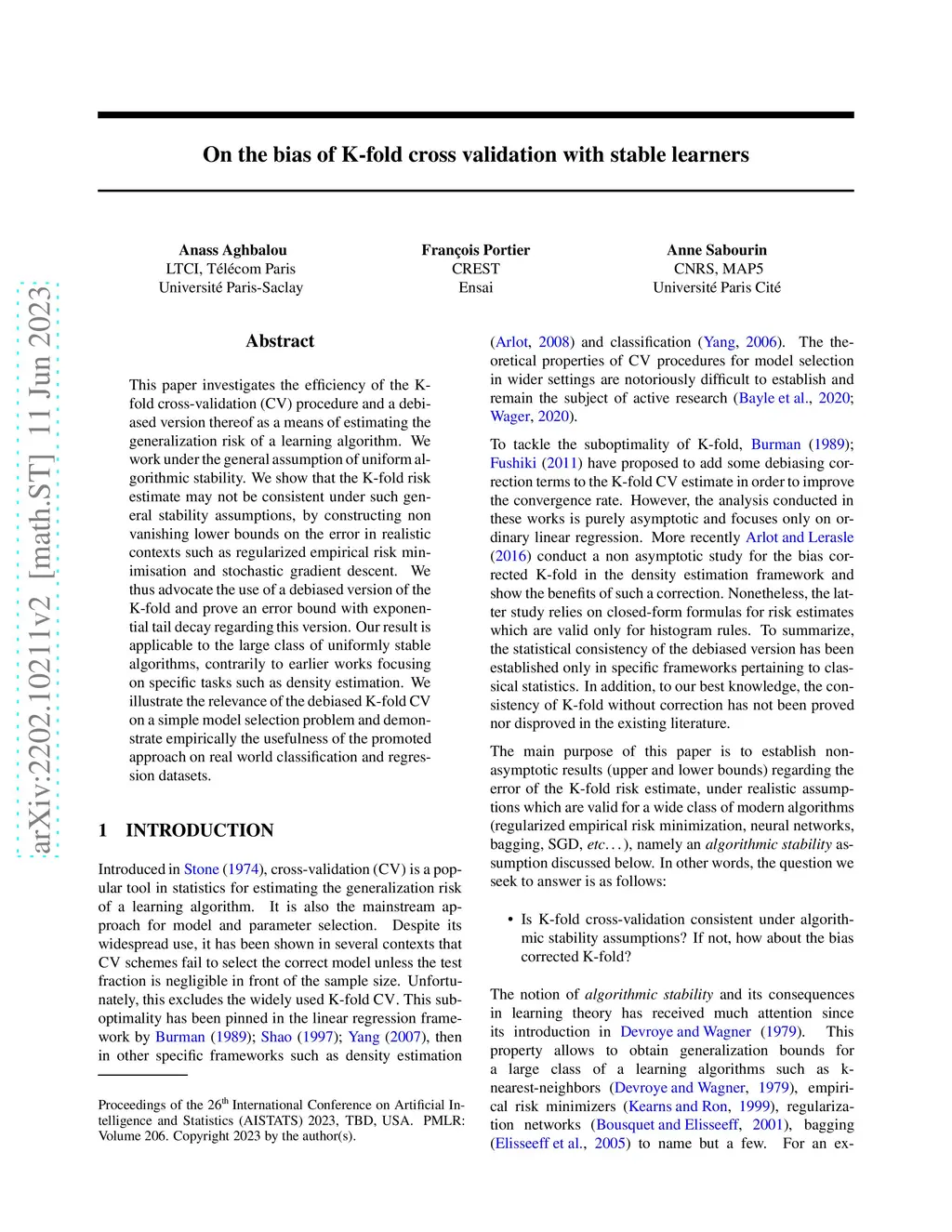 On the bias of K-fold cross validation with stable learners