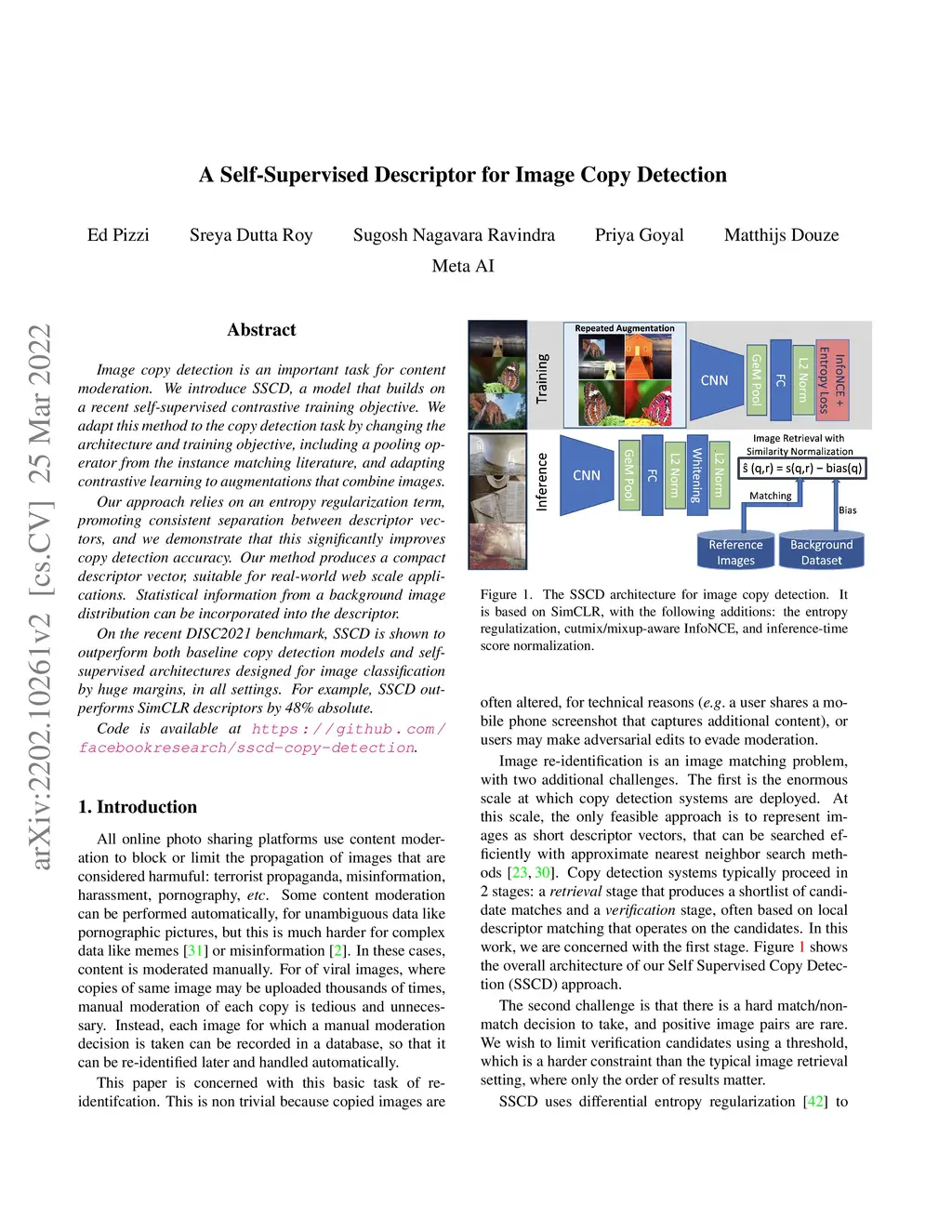 Image copy detection is an important task for content moderation. We introduce SSCD, a model that builds on a recent self-supervised contrastive training objective. We adapt this method to the copy detection task by changing the architecture and training objective, including a pooling operator from the instance matching literature, and adapting contrastive learning to augmentations that combine images. Our approach relies on an entropy regularization term, promoting consistent separation between descriptor vectors, and we demonstrate that this significantly improves copy detection accuracy. Our method produces a compact descriptor vector, suitable for real-world web scale applications. Statistical information from a background image distribution can be incorporated into the descriptor. On the recent DISC2021 benchmark, SSCD is shown to outperform both baseline copy detection models and self-supervised architectures designed for image classification by huge margins, in all settings. For example, SSCD out-performs SimCLR descriptors by 48% absolute. Code is available at https://github.com/facebookresearch/sscd-copy-detection.