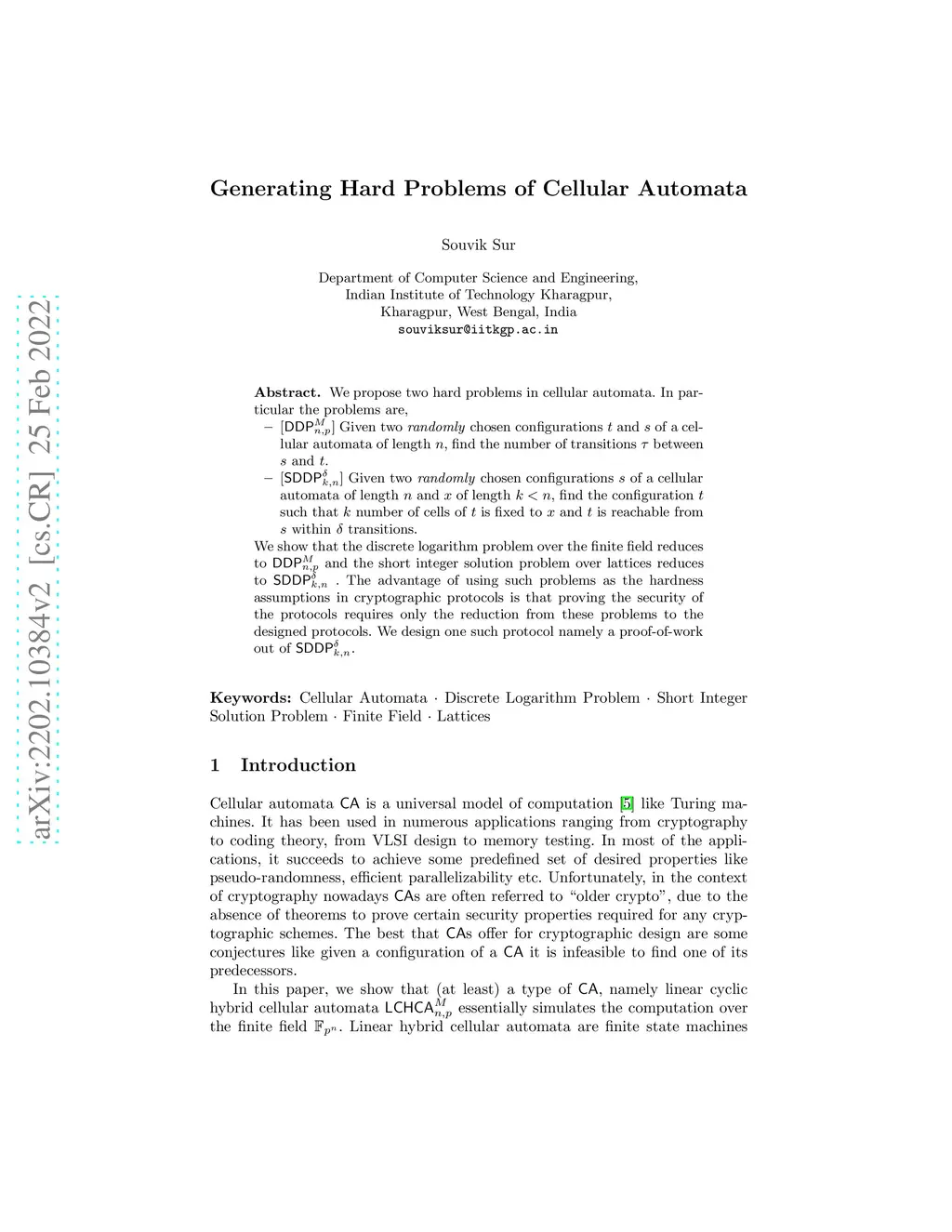 We propose two hard problems in cellular automata. In particular the problems are: [DDP] Given two \emph{randomly} chosen configurations and of a cellular automata of length , find the number of transitions between and . [SDDP] Given two \emph{randomly} chosen configurations of a cellular automata of length and of length , find the configuration such that number of cells of is fixed to and is reachable from within transitions. We show that the discrete logarithm problem over the finite field reduces to DDP and the short integer solution problem over lattices reduces to SDDP. The advantage of using such problems as the hardness assumptions in cryptographic protocols is that proving the security of the protocols requires only the reduction from these problems to the designed protocols. We design one such protocol namely a proof-of-work out of SDDP.