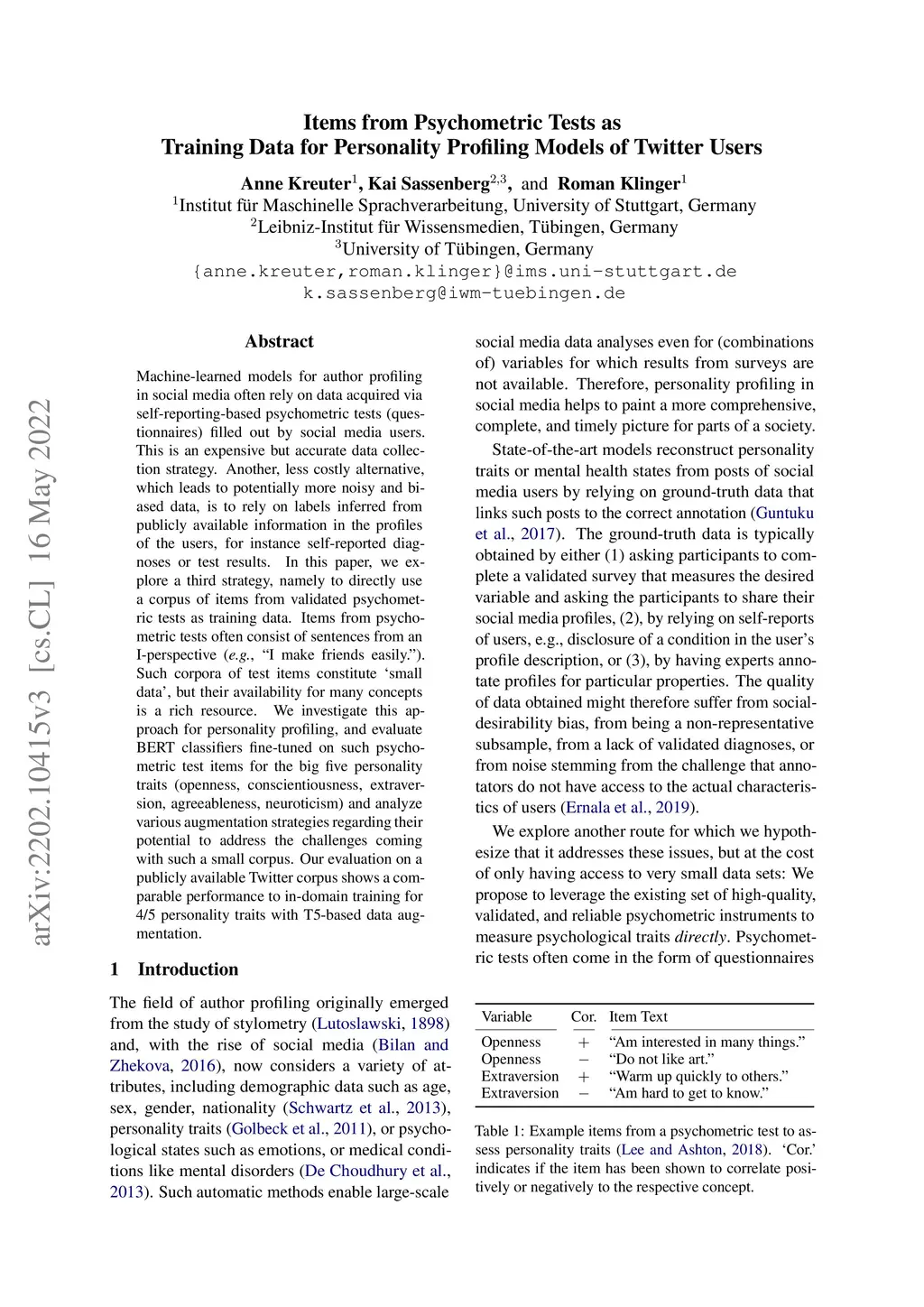 Items from Psychometric Tests as Training Data for Personality Profiling