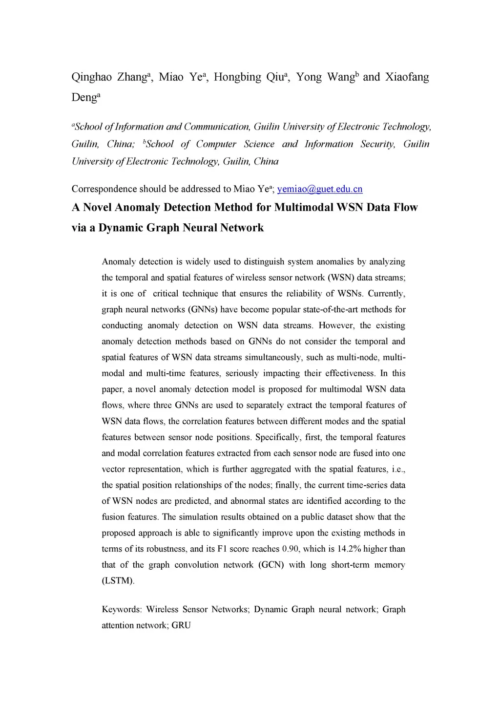 Anomaly detection is widely used to distinguish system anomalies by analyzing the temporal and spatial features of wireless sensor network (WSN) data streams; it is one of critical technique that ensures the reliability of WSNs. Currently, graph neural networks (GNNs) have become popular state-of-the-art methods for conducting anomaly detection on WSN data streams. However, the existing anomaly detection methods based on GNNs do not consider the temporal and spatial features of WSN data streams simultaneously, such as multi-node, multi-modal and multi-time features, seriously impacting their effectiveness. In this paper, a novel anomaly detection model is proposed for multimodal WSN data flows, where three GNNs are used to separately extract the temporal features of WSN data flows, the correlation features between different modes and the spatial features between sensor node positions. Specifically, first, the temporal features and modal correlation features extracted from each sensor node are fused into one vector representation, which is further aggregated with the spatial features, i.e., the spatial position relationships of the nodes; finally, the current time-series data of WSN nodes are predicted, and abnormal states are identified according to the fusion features. The simulation results obtained on a public dataset show that the proposed approach is able to significantly improve upon the existing methods in terms of its robustness, and its F1 score reaches 0.90, which is 14.2% higher than that of the graph convolution network (GCN) with long short-term memory (LSTM).