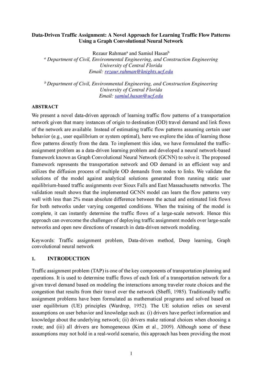 We present a novel data-driven approach of learning traffic flow patterns of a transportation network given that many instances of origin to destination (OD) travel demand and link flows of the network are available. Instead of estimating traffic flow patterns assuming certain user behavior (e.g., user equilibrium or system optimal), here we explore the idea of learning those flow patterns directly from the data. To implement this idea, we have formulated the traffic-assignment problem as a data-driven learning problem and developed a neural network-based framework known as Graph Convolutional Neural Network (GCNN) to solve it. The proposed framework represents the transportation network and OD demand in an efficient way and utilizes the diffusion process of multiple OD demands from nodes to links. We validate the solutions of the model against analytical solutions generated from running static user equilibrium-based traffic assignments over Sioux Falls and East Massachusetts networks. The validation result shows that the implemented GCNN model can learn the flow patterns very well with less than 2% mean absolute difference between the actual and estimated link flows for both networks under varying congested conditions. When the training of the model is complete, it can instantly determine the traffic flows of a large-scale network. Hence this approach can overcome the challenges of deploying traffic assignment models over large-scale networks and open new directions of research in data-driven network modeling.