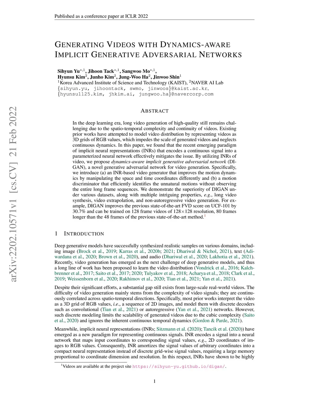 Generating Videos with Dynamics-aware Implicit Generative Adversarial
