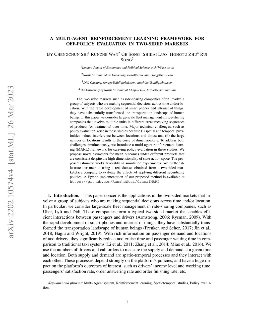 The two-sided markets such as ride-sharing companies often involve a group of subjects who are making sequential decisions across time and/or location. With the rapid development of smart phones and internet of things, they have substantially transformed the transportation landscape of human beings. In this paper we consider large-scale fleet management in ride-sharing companies that involve multiple units in different areas receiving sequences of products (or treatments) over time. Major technical challenges, such as policy evaluation, arise in those studies because (i) spatial and temporal proximities induce interference between locations and times; and (ii) the large number of locations results in the curse of dimensionality. To address both challenges simultaneously, we introduce a multi-agent reinforcement learning (MARL) framework for carrying policy evaluation in these studies. We propose novel estimators for mean outcomes under different products that are consistent despite the high-dimensionality of state-action space. The proposed estimator works favorably in simulation experiments. We further illustrate our method using a real dataset obtained from a two-sided marketplace company to evaluate the effects of applying different subsidizing policies. A Python implementation of our proposed method is available at https://github.com/RunzheStat/CausalMARL.
