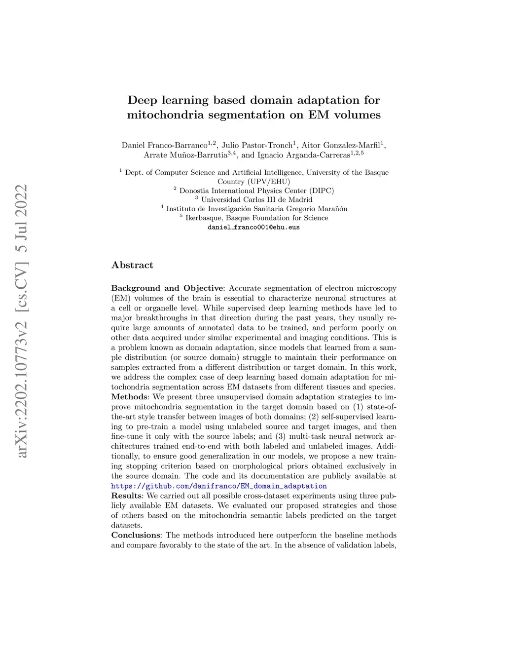 Deep learning based domain adaptation for mitochondria segmentation on
