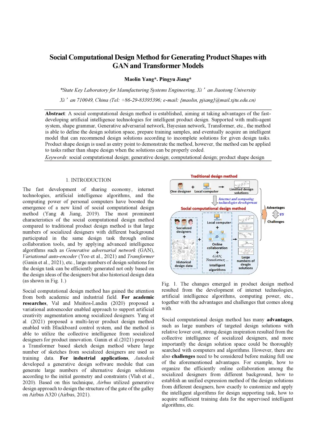 A social computational design method is established, aiming at taking advantages of the fast-developing artificial intelligence technologies for intelligent product design. Supported with multi-agent system, shape grammar, Generative adversarial network, Bayesian network, Transformer, etc., the method is able to define the design solution space, prepare training samples, and eventually acquire an intelligent model that can recommend design solutions according to incomplete solutions for given design tasks. Product shape design is used as entry point to demonstrate the method, however, the method can be applied to tasks rather than shape design when the solutions can be properly coded.