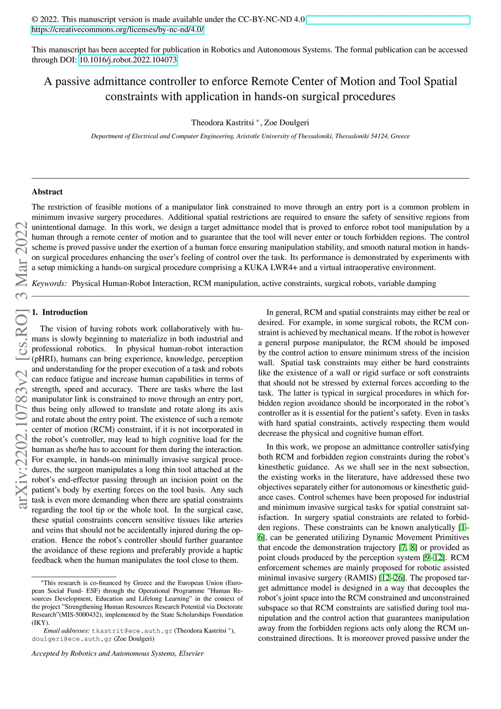 A passive admittance controller to enforce Remote Center of Motion and