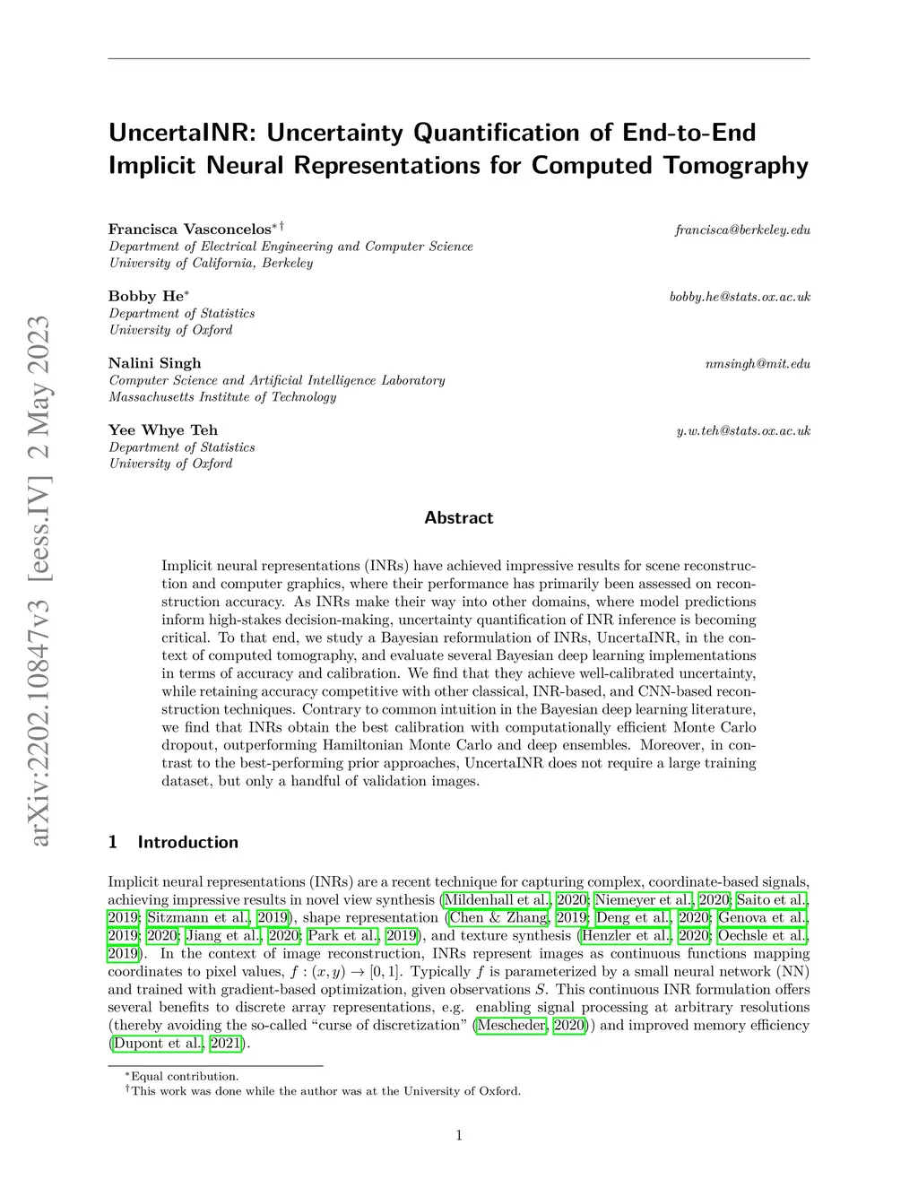Implicit neural representations (INRs) have achieved impressive results for scene reconstruction and computer graphics, where their performance has primarily been assessed on reconstruction accuracy. As INRs make their way into other domains, where model predictions inform high-stakes decision-making, uncertainty quantification of INR inference is becoming critical. To that end, we study a Bayesian reformulation of INRs, UncertaINR, in the context of computed tomography, and evaluate several Bayesian deep learning implementations in terms of accuracy and calibration. We find that they achieve well-calibrated uncertainty, while retaining accuracy competitive with other classical, INR-based, and CNN-based reconstruction techniques. Contrary to common intuition in the Bayesian deep learning literature, we find that INRs obtain the best calibration with computationally efficient Monte Carlo dropout, outperforming Hamiltonian Monte Carlo and deep ensembles. Moreover, in contrast to the best-performing prior approaches, UncertaINR does not require a large training dataset, but only a handful of validation images.