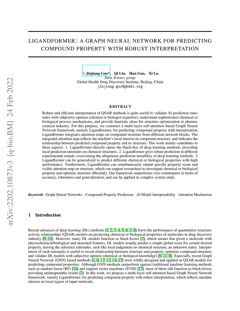 Robust and efficient interpretation of QSAR methods is quite useful to validate AI prediction rationales with subjective opinion (chemist or biologist expertise), understand sophisticated chemical or biological process mechanisms, and provide heuristic ideas for structure optimization in pharmaceutical industry. For this purpose, we construct a multi-layer self-attention based Graph Neural Network framework, namely Ligandformer, for predicting ligand property with interpretation. Ligandformer integrates attention maps on ligand structure from different network blocks. The integrated attention map reflects the machine's local interest on compound structure, and indicates the relationship between predicted compound property and its structure. This work mainly contributes to three aspects: 1. Ligandformer directly opens the black-box of deep learning methods, providing local prediction rationales on chemical structures. 2. Ligandformer gives robust prediction in different experimental rounds, overcoming the ubiquitous prediction instability of deep learning methods. 3. Ligandformer can be generalized to predict different chemical or biological properties with high performance. Furthermore, Ligandformer can simultaneously output specific property score and visible attention map on structure, which can support researchers to investigate chemical or biological property and optimize structure efficiently. Our framework outperforms over counterparts in terms of accuracy, robustness and generalization, and can be applied in complex system study.