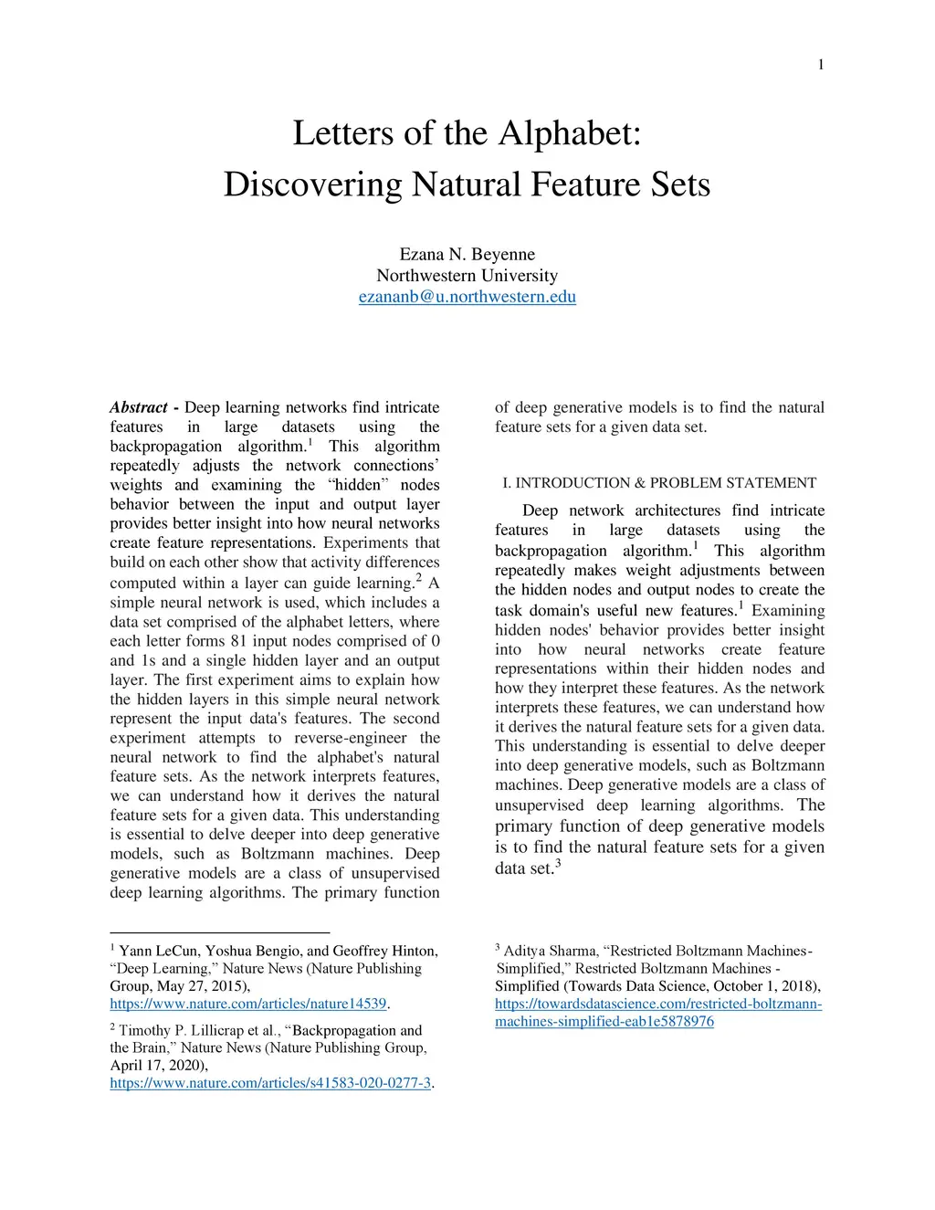 Deep learning networks find intricate features in large datasets using the backpropagation algorithm. This algorithm repeatedly adjusts the network connections.' weights and examining the "hidden" nodes behavior between the input and output layer provides better insight into how neural networks create feature representations. Experiments built on each other show that activity differences computed within a layer can guide learning. A simple neural network is used, which includes a data set comprised of the alphabet letters, where each letter forms 81 input nodes comprised of 0 and 1s and a single hidden layer and an output layer. The first experiment explains how the hidden layers in this simple neural network represent the input data's features. The second experiment attempts to reverse-engineer the neural network to find the alphabet's natural feature sets. As the network interprets features, we can understand how it derives the natural feature sets for a given data. This understanding is essential to delve deeper into deep generative models, such as Boltzmann machines. Deep generative models are a class of unsupervised deep learning algorithms. The primary function of deep generative models is to find the natural feature sets for a given data set.