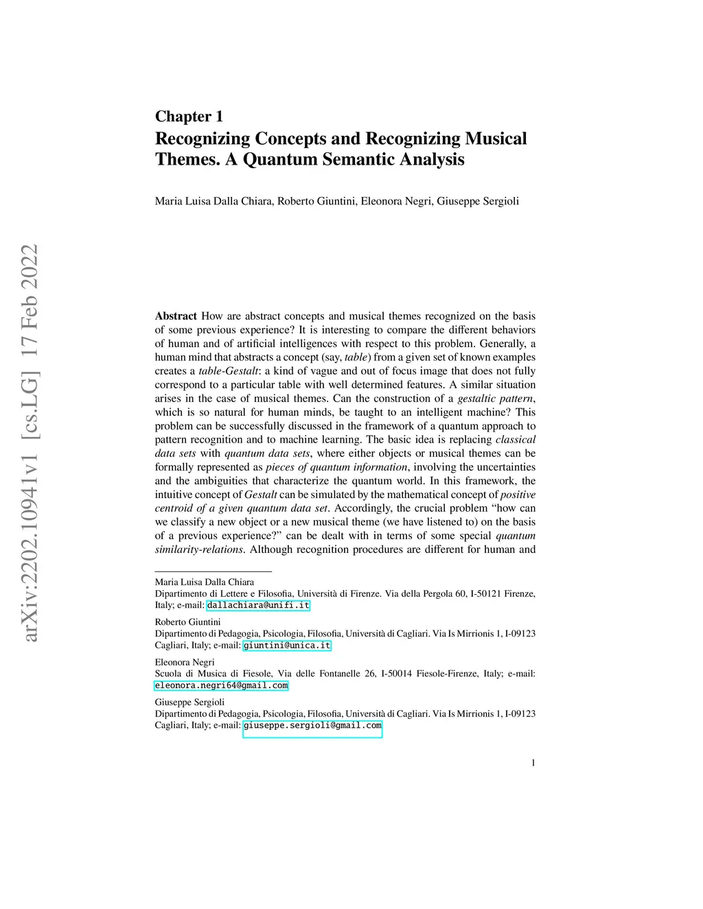 How are abstract concepts and musical themes recognized on the basis of some previous experience? It is interesting to compare the different behaviors of human and of artificial intelligences with respect to this problem. Generally, a human mind that abstracts a concept (say, table) from a given set of known examples creates a table-Gestalt: a kind of vague and out of focus image that does not fully correspond to a particular table with well determined features. A similar situation arises in the case of musical themes. Can the construction of a gestaltic pattern, which is so natural for human minds, be taught to an intelligent machine? This problem can be successfully discussed in the framework of a quantum approach to pattern recognition and to machine learning. The basic idea is replacing classical data sets with quantum data sets, where either objects or musical themes can be formally represented as pieces of quantum information, involving the uncertainties and the ambiguities that characterize the quantum world. In this framework, the intuitive concept of Gestalt can be simulated by the mathematical concept of positive centroid of a given quantum data set. Accordingly, the crucial problem "how can we classify a new object or a new musical theme (we have listened to) on the basis of a previous experience?" can be dealt with in terms of some special quantum similarity-relations. Although recognition procedures are different for human and for artificial intelligences, there is a common method of "facing the problems" that seems to work in both cases.