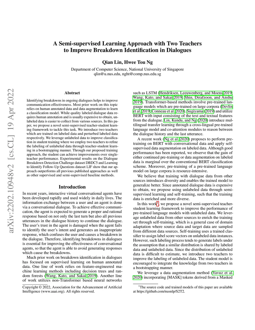 A Semi-supervised Learning Approach with Two Teachers to Improve
