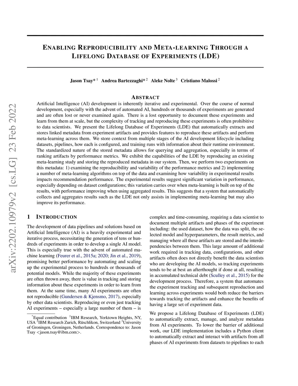 Artificial Intelligence (AI) development is inherently iterative and experimental. Over the course of normal development, especially with the advent of automated AI, hundreds or thousands of experiments are generated and are often lost or never examined again. There is a lost opportunity to document these experiments and learn from them at scale, but the complexity of tracking and reproducing these experiments is often prohibitive to data scientists. We present the Lifelong Database of Experiments (LDE) that automatically extracts and stores linked metadata from experiment artifacts and provides features to reproduce these artifacts and perform meta-learning across them. We store context from multiple stages of the AI development lifecycle including datasets, pipelines, how each is configured, and training runs with information about their runtime environment. The standardized nature of the stored metadata allows for querying and aggregation, especially in terms of ranking artifacts by performance metrics. We exhibit the capabilities of the LDE by reproducing an existing meta-learning study and storing the reproduced metadata in our system. Then, we perform two experiments on this metadata: 1) examining the reproducibility and variability of the performance metrics and 2) implementing a number of meta-learning algorithms on top of the data and examining how variability in experimental results impacts recommendation performance. The experimental results suggest significant variation in performance, especially depending on dataset configurations; this variation carries over when meta-learning is built on top of the results, with performance improving when using aggregated results. This suggests that a system that automatically collects and aggregates results such as the LDE not only assists in implementing meta-learning but may also improve its performance.