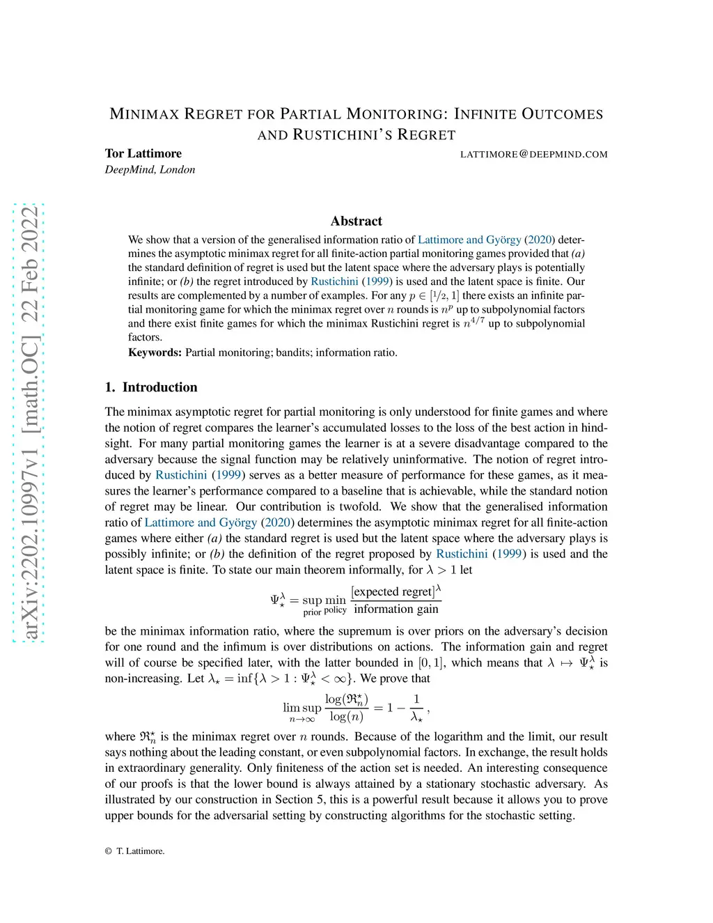 We show that a version of the generalised information ratio of Lattimore and Gyorgy (2020) determines the asymptotic minimax regret for all finite-action partial monitoring games provided that (a) the standard definition of regret is used but the latent space where the adversary plays is potentially infinite; or (b) the regret introduced by Rustichini (1999) is used and the latent space is finite. Our results are complemented by a number of examples. For any there exists an infinite partial monitoring game for which the minimax regret over rounds is up to subpolynomial factors and there exist finite games for which the minimax Rustichini regret is up to subpolynomial factors.
