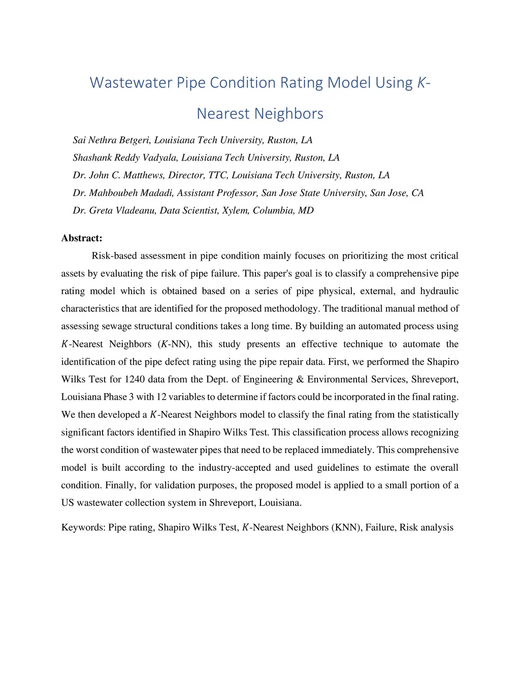 Wastewater Pipe Condition Rating Model Using K- Nearest Neighbors