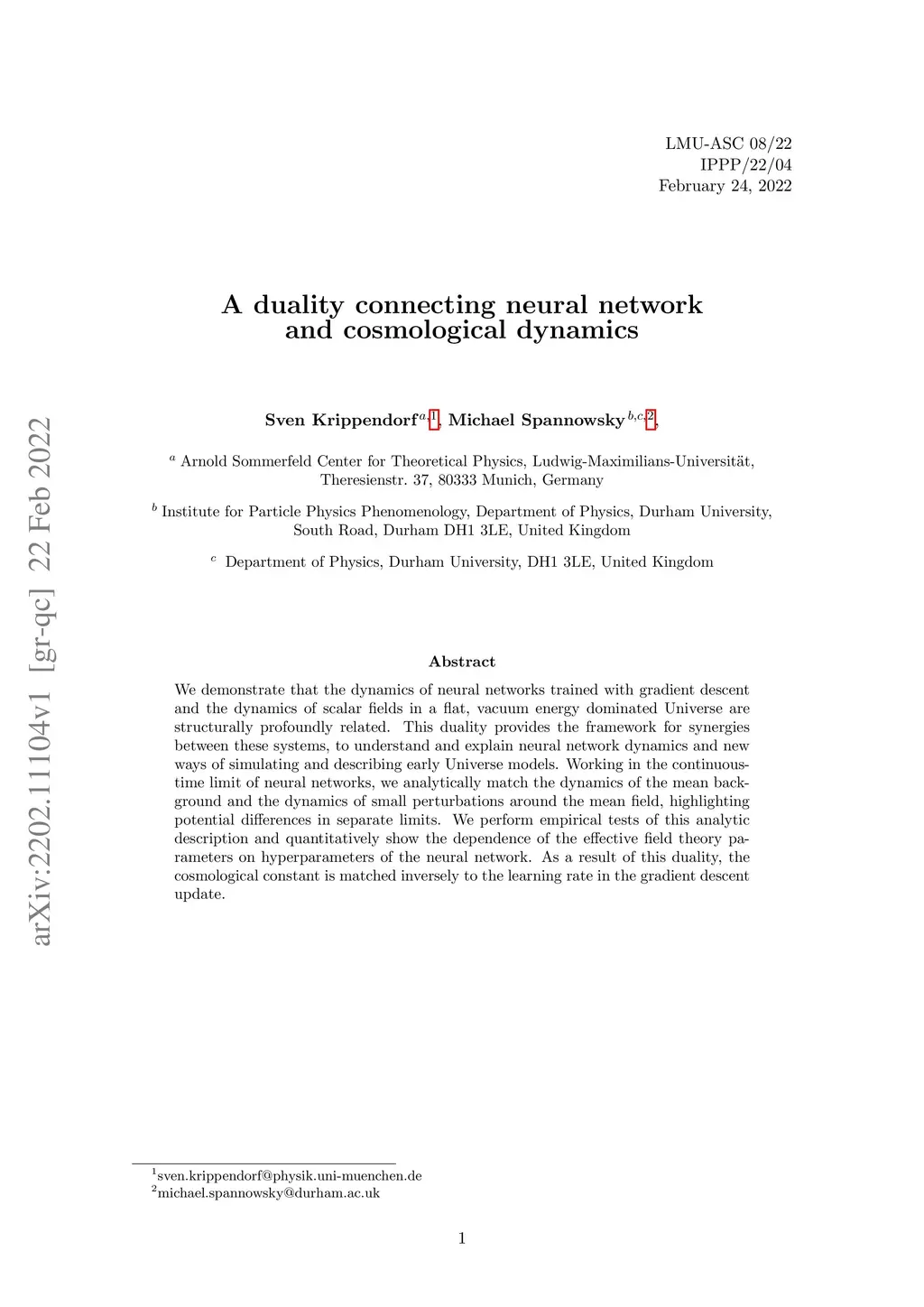We demonstrate that the dynamics of neural networks trained with gradient descent and the dynamics of scalar fields in a flat, vacuum energy dominated Universe are structurally profoundly related. This duality provides the framework for synergies between these systems, to understand and explain neural network dynamics and new ways of simulating and describing early Universe models. Working in the continuous-time limit of neural networks, we analytically match the dynamics of the mean background and the dynamics of small perturbations around the mean field, highlighting potential differences in separate limits. We perform empirical tests of this analytic description and quantitatively show the dependence of the effective field theory parameters on hyperparameters of the neural network. As a result of this duality, the cosmological constant is matched inversely to the learning rate in the gradient descent update.