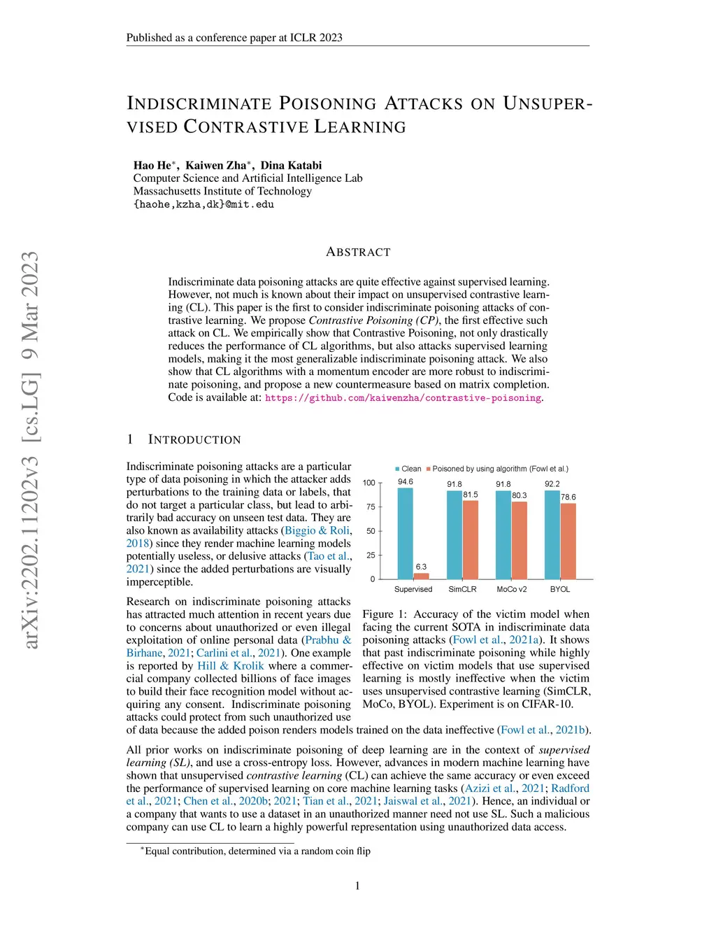 Indiscriminate data poisoning attacks are quite effective against supervised learning. However, not much is known about their impact on unsupervised contrastive learning (CL). This paper is the first to consider indiscriminate poisoning attacks of contrastive learning. We propose Contrastive Poisoning (CP), the first effective such attack on CL. We empirically show that Contrastive Poisoning, not only drastically reduces the performance of CL algorithms, but also attacks supervised learning models, making it the most generalizable indiscriminate poisoning attack. We also show that CL algorithms with a momentum encoder are more robust to indiscriminate poisoning, and propose a new countermeasure based on matrix completion. Code is available at: https://github.com/kaiwenzha/contrastive-poisoning.