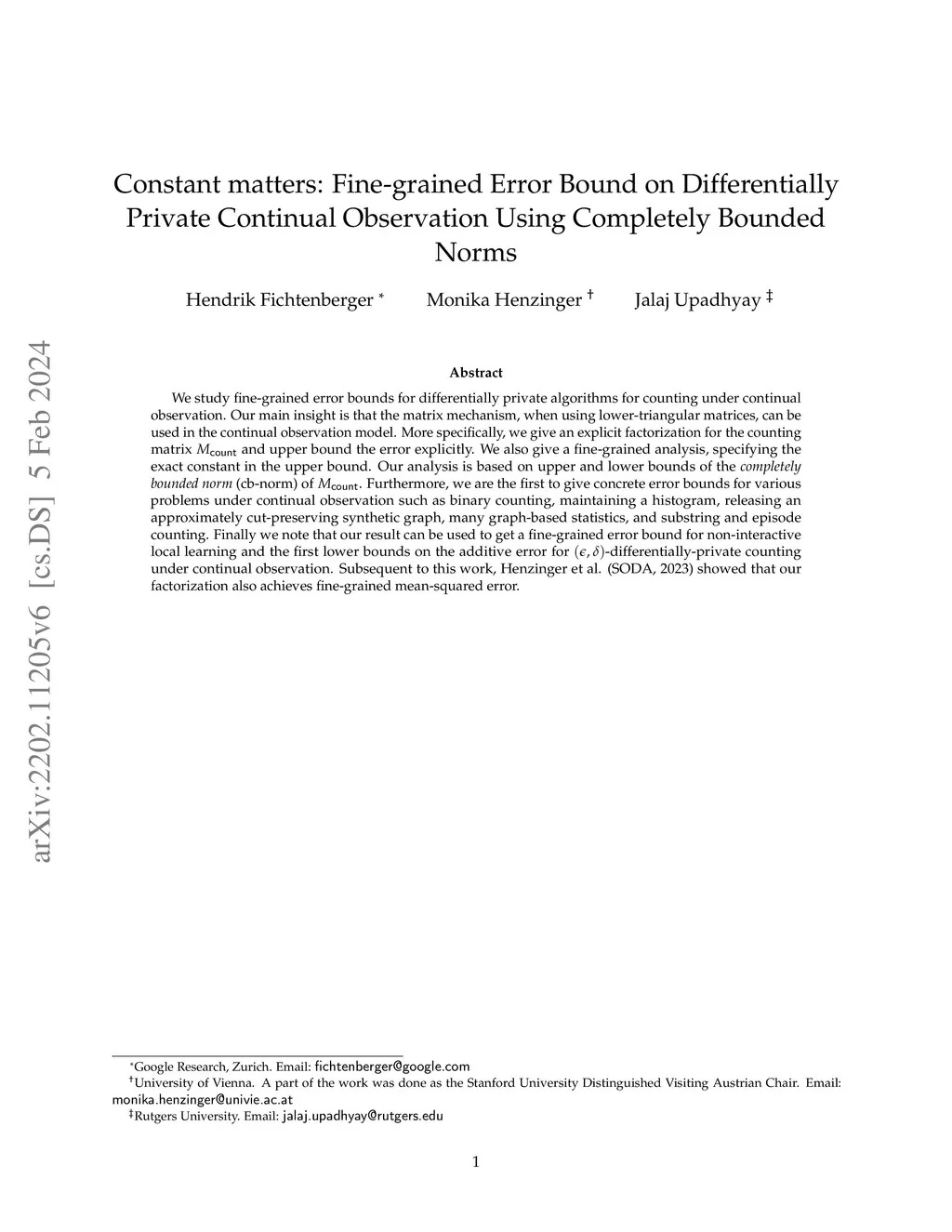 We study fine-grained error bounds for differentially private algorithms for counting under continual observation. Our main insight is that the matrix mechanism when using lower-triangular matrices can be used in the continual observation model. More specifically, we give an explicit factorization for the counting matrix and upper bound the error explicitly. We also give a fine-grained analysis, specifying the exact constant in the upper bound. Our analysis is based on upper and lower bounds of the {\em completely bounded norm} (cb-norm) of . Along the way, we improve the best-known bound of 28 years by Mathias (SIAM Journal on Matrix Analysis and Applications, 1993) on the cb-norm of for a large range of the dimension of . Furthermore, we are the first to give concrete error bounds for various problems under continual observation such as binary counting, maintaining a histogram, releasing an approximately cut-preserving synthetic graph, many graph-based statistics, and substring and episode counting. Finally, we note that our result can be used to get a fine-grained error bound for non-interactive local learning {and the first lower bounds on the additive error for -differentially-private counting under continual observation.} Subsequent to this work, Henzinger et al. (SODA2023) showed that our factorization also achieves fine-grained mean-squared error.