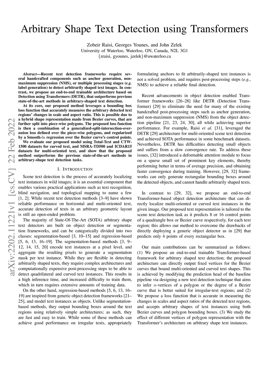 Recent text detection frameworks require several handcrafted components such as anchor generation, non-maximum suppression (NMS), or multiple processing stages (e.g. label generation) to detect arbitrarily shaped text images. In contrast, we propose an end-to-end trainable architecture based on Detection using Transformers (DETR), that outperforms previous state-of-the-art methods in arbitrary-shaped text detection. At its core, our proposed method leverages a bounding box loss function that accurately measures the arbitrary detected text regions' changes in scale and aspect ratio. This is possible due to a hybrid shape representation made from Bezier curves, that are further split into piece-wise polygons. The proposed loss function is then a combination of a generalized-split-intersection-over-union loss defined over the piece-wise polygons and regularized by a Smooth- regression over the Bezier curve's control points. We evaluate our proposed model using Total-Text and CTW-1500 datasets for curved text, and MSRA-TD500 and ICDAR15 datasets for multi-oriented text, and show that the proposed method outperforms the previous state-of-the-art methods in arbitrary-shape text detection tasks.