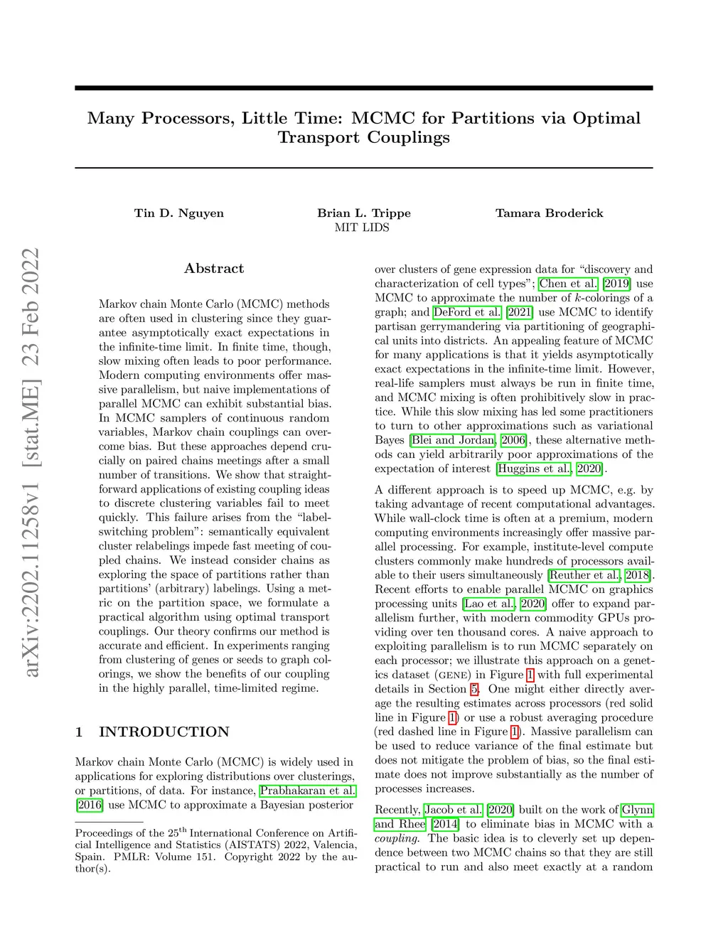 Markov chain Monte Carlo (MCMC) methods are often used in clustering since they guarantee asymptotically exact expectations in the infinite-time limit. In finite time, though, slow mixing often leads to poor performance. Modern computing environments offer massive parallelism, but naive implementations of parallel MCMC can exhibit substantial bias. In MCMC samplers of continuous random variables, Markov chain couplings can overcome bias. But these approaches depend crucially on paired chains meetings after a small number of transitions. We show that straightforward applications of existing coupling ideas to discrete clustering variables fail to meet quickly. This failure arises from the "label-switching problem": semantically equivalent cluster relabelings impede fast meeting of coupled chains. We instead consider chains as exploring the space of partitions rather than partitions' (arbitrary) labelings. Using a metric on the partition space, we formulate a practical algorithm using optimal transport couplings. Our theory confirms our method is accurate and efficient. In experiments ranging from clustering of genes or seeds to graph colorings, we show the benefits of our coupling in the highly parallel, time-limited regime.