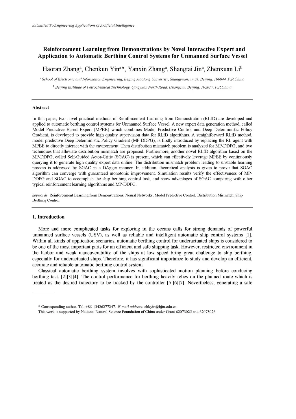In this paper, two novel practical methods of Reinforcement Learning from Demonstration (RLfD) are developed and applied to automatic berthing control systems for Unmanned Surface Vessel. A new expert data generation method, called Model Predictive Based Expert (MPBE) which combines Model Predictive Control and Deep Deterministic Policy Gradient, is developed to provide high quality supervision data for RLfD algorithms. A straightforward RLfD method, model predictive Deep Deterministic Policy Gradient (MP-DDPG), is firstly introduced by replacing the RL agent with MPBE to directly interact with the environment. Then distribution mismatch problem is analyzed for MP-DDPG, and two techniques that alleviate distribution mismatch are proposed. Furthermore, another novel RLfD algorithm based on the MP-DDPG, called Self-Guided Actor-Critic (SGAC) is present, which can effectively leverage MPBE by continuously querying it to generate high quality expert data online. The distribution mismatch problem leading to unstable learning process is addressed by SGAC in a DAgger manner. In addition, theoretical analysis is given to prove that SGAC algorithm can converge with guaranteed monotonic improvement. Simulation results verify the effectiveness of MP-DDPG and SGAC to accomplish the ship berthing control task, and show advantages of SGAC comparing with other typical reinforcement learning algorithms and MP-DDPG.