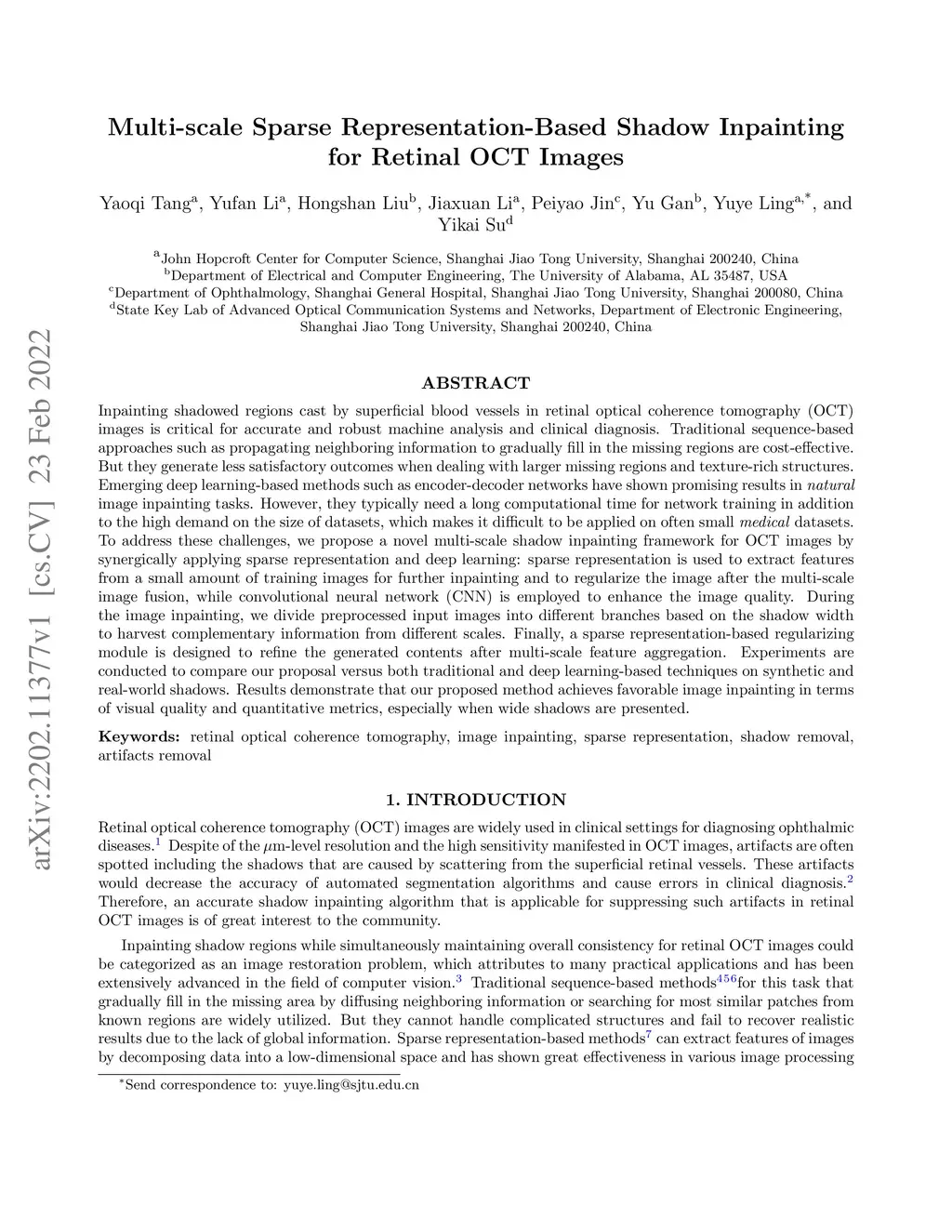 Inpainting shadowed regions cast by superficial blood vessels in retinal optical coherence tomography (OCT) images is critical for accurate and robust machine analysis and clinical diagnosis. Traditional sequence-based approaches such as propagating neighboring information to gradually fill in the missing regions are cost-effective. But they generate less satisfactory outcomes when dealing with larger missing regions and texture-rich structures. Emerging deep learning-based methods such as encoder-decoder networks have shown promising results in natural image inpainting tasks. However, they typically need a long computational time for network training in addition to the high demand on the size of datasets, which makes it difficult to be applied on often small medical datasets. To address these challenges, we propose a novel multi-scale shadow inpainting framework for OCT images by synergically applying sparse representation and deep learning: sparse representation is used to extract features from a small amount of training images for further inpainting and to regularize the image after the multi-scale image fusion, while convolutional neural network (CNN) is employed to enhance the image quality. During the image inpainting, we divide preprocessed input images into different branches based on the shadow width to harvest complementary information from different scales. Finally, a sparse representation-based regularizing module is designed to refine the generated contents after multi-scale feature aggregation. Experiments are conducted to compare our proposal versus both traditional and deep learning-based techniques on synthetic and real-world shadows. Results demonstrate that our proposed method achieves favorable image inpainting in terms of visual quality and quantitative metrics, especially when wide shadows are presented.