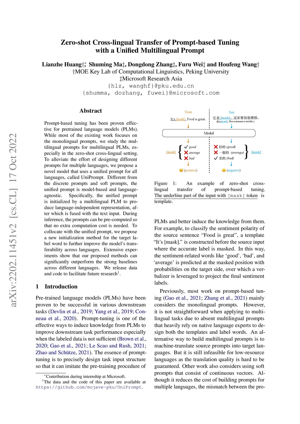 Zero-shot Cross-lingual Transfer of Prompt-based Tuning with a Unified